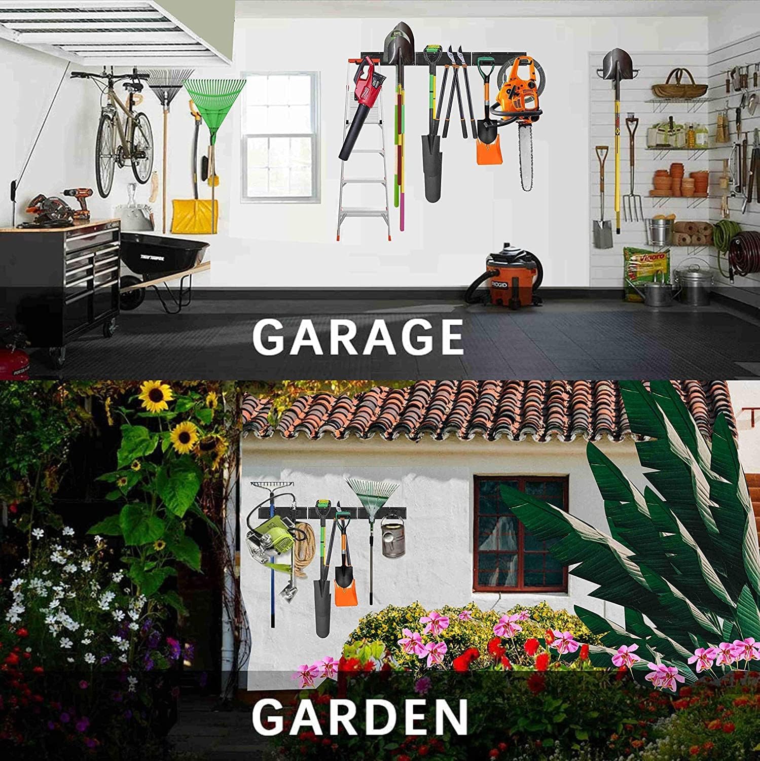 - VERSATILE WALL STORAGE SYSTEM: Our multifunctional tool storage rack accommodates a wide range of items, including garden tools, shovels, rakes, brooms, mops, extension cords, hoses, power tools, chairs, ladders, and sporting equipment. Effectively optimizing your storage space while keeping everything easily accessible and organized.