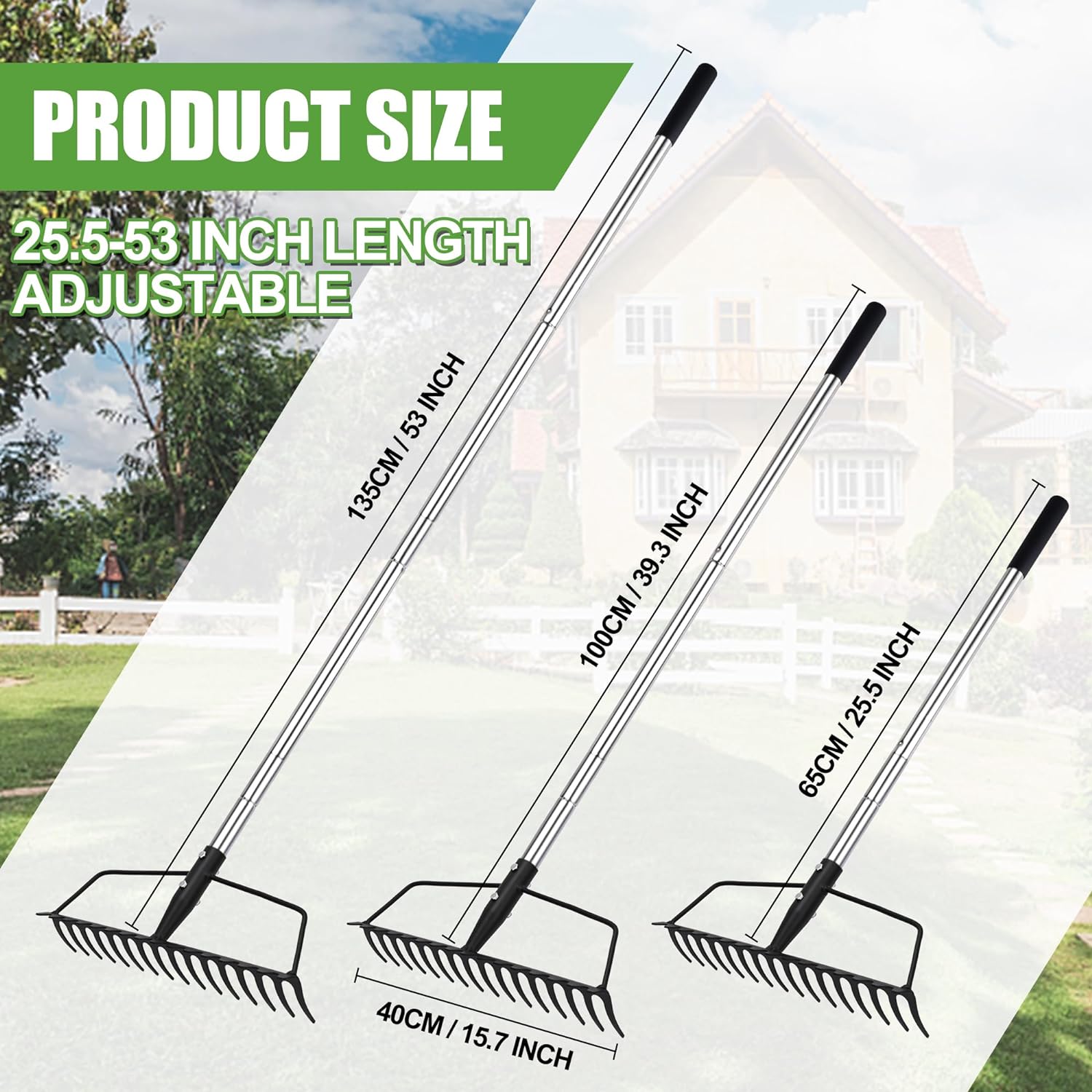 - Adjustable Handle : Lawn leveling rakes have multi-jointed handles that can be adjusted to the desired length by attaching different numbers of poles. This allows you to customize the heavy duty rakes length according to your preference and work requirements, plus it makes it easy to store and carry