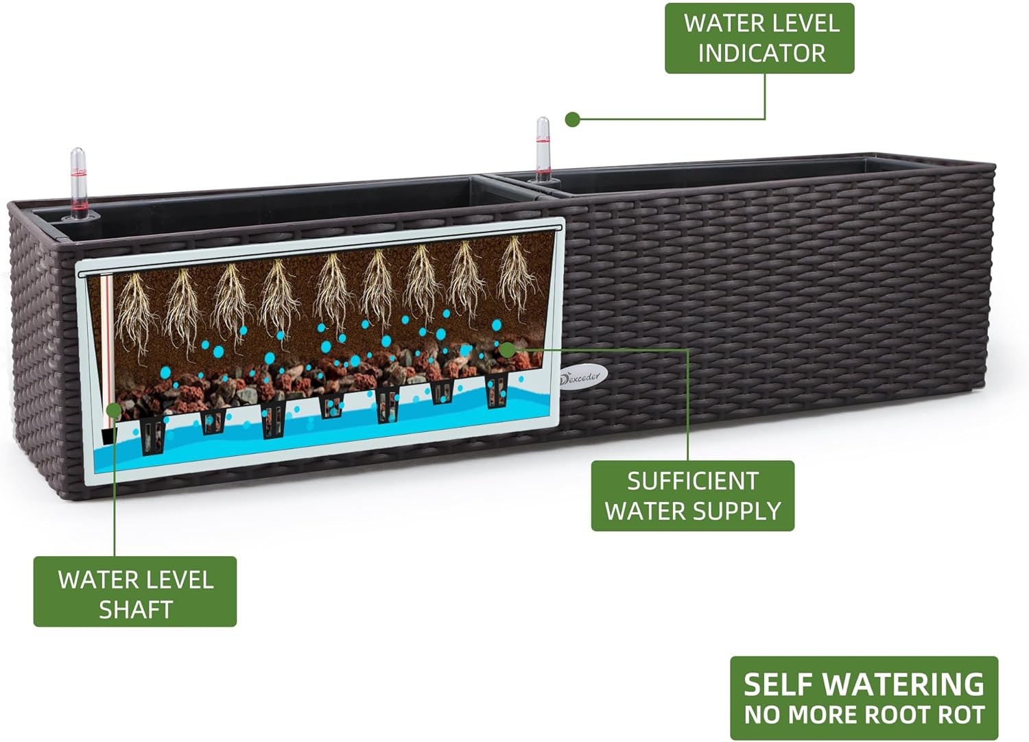 Dexceder 31.5 Inch Rattan Self Watering Planter Indoor Outdoor, Thickened Large Rail Flower Plant Pot Window Box with Water Level Indicators & Bracket (Brown)