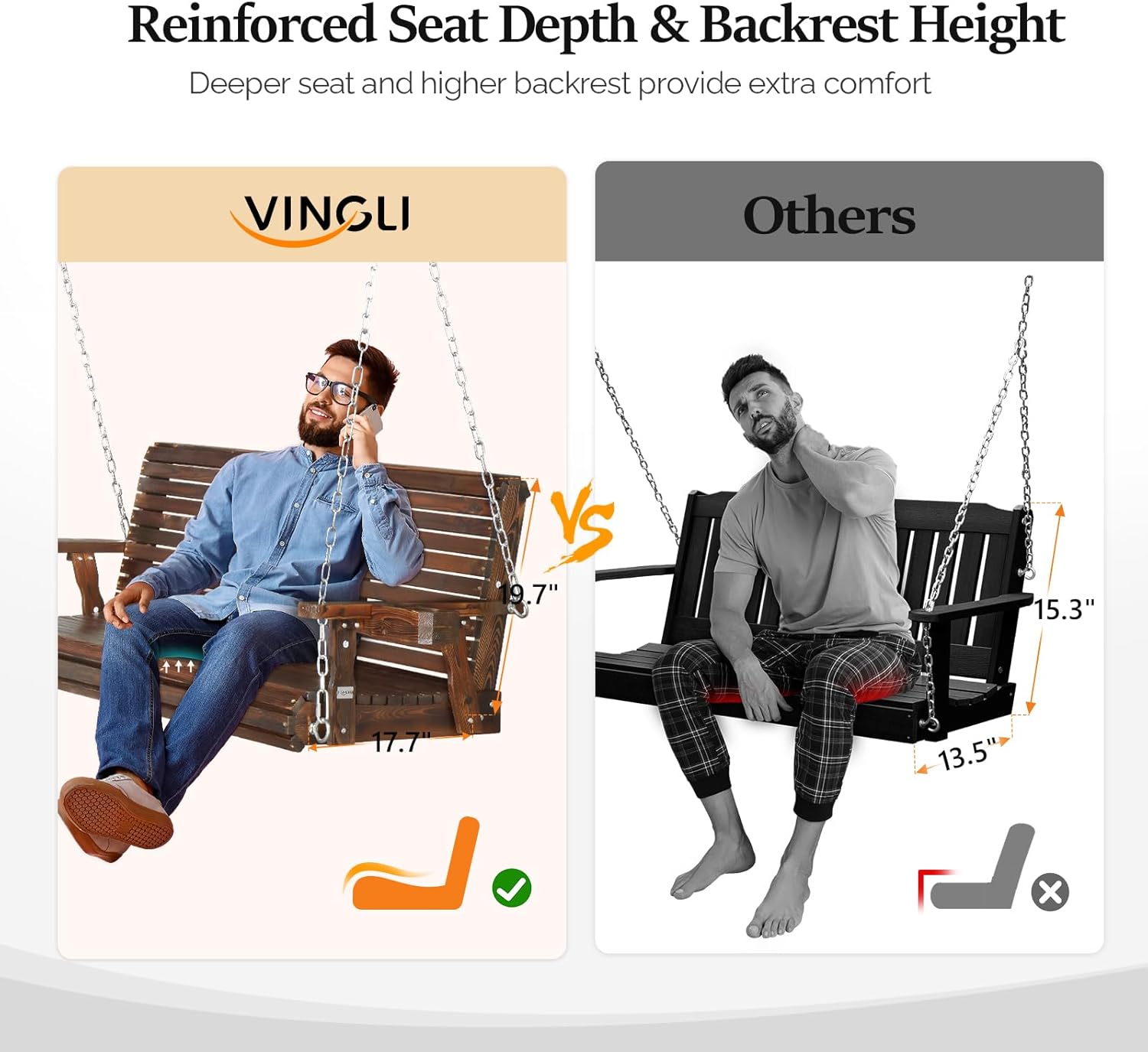 - Upgraded Product Size - We add the seat depth and backrest height on our swing bench, only to better support your body and bring more relaxation. Seat Depth = 21.7โ and Backrest Height = 19.7โ