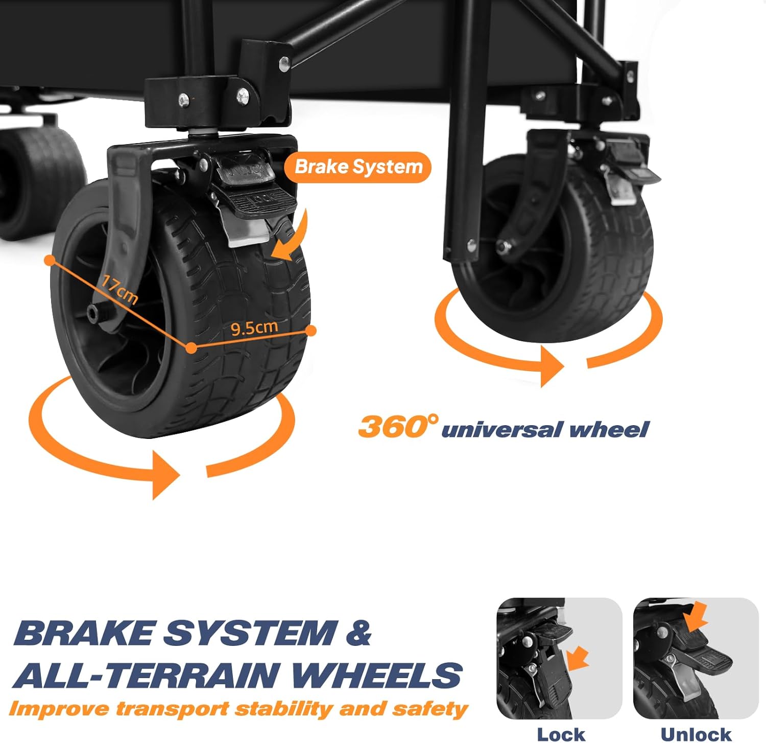 - Enhanced Mobility and Stability:Large, Robust Wheels. The wheels, with a 17 cm diameter and 9.5 cm width, provide excellent stability and smooth movement over diverse terrains, from rocky paths to sandy beaches.Swivel Wheels with Brakes.The swivel wheels offer superior maneuverability, making it easy to navigate through campsites.The sturdy construction and integrated brakes ensure your gear stays secure during transport and when stationary, preventing accidental rolling or tipping over.