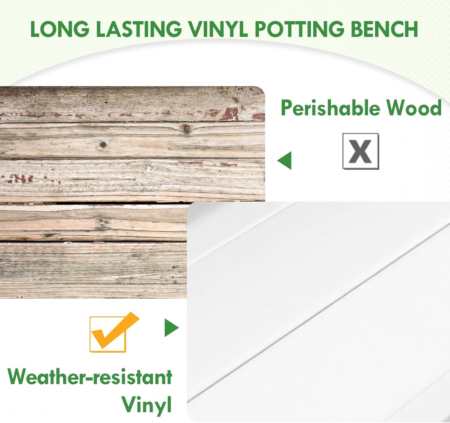 - STURDY PREMIUM VINYL: The EAGLE PEAK outdoor garden potting bench is made of high quality vinyl, which provides a waterproof, corrosion-resistant and maintenance-free workspace. It will not crack, fade, or peel allowing for years of dependable use.