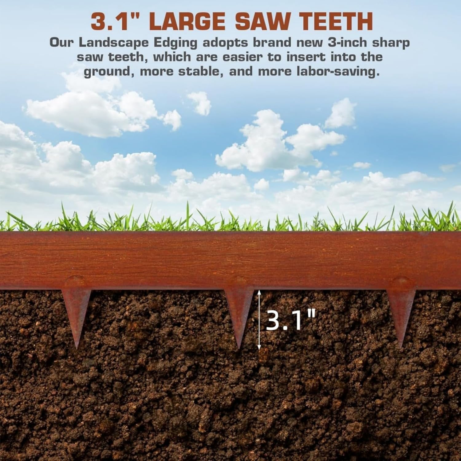 - HEAVY DUTY CORTEN STEEL MATERIAL - Our metal garden landscape edging is made of heavy-duty corten steel for durability. The unique large tooth design ensures stability and strength, providing lasting support for your outdoor space. Take care to wear gloves during use