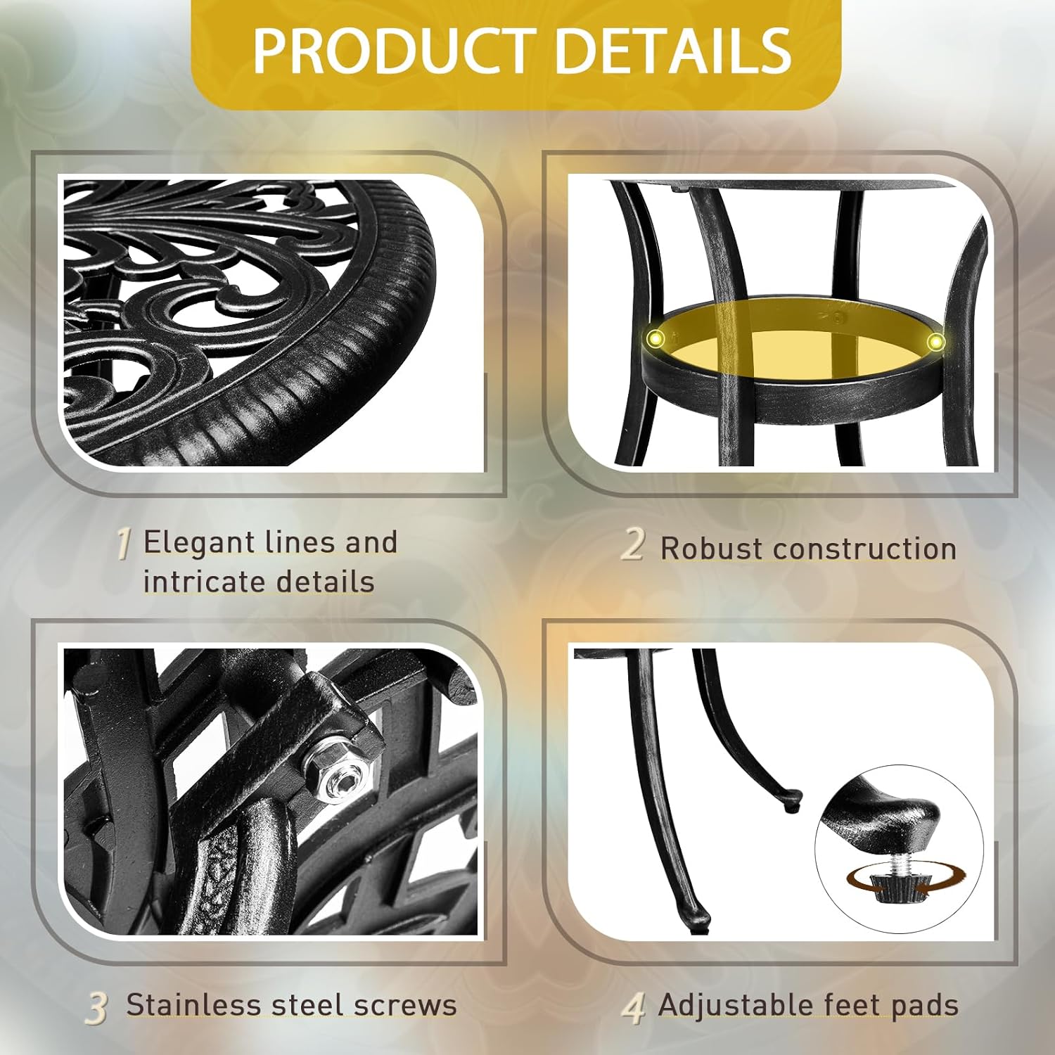 - PREMIUM CAST ALUMINUM: Crafted from high-quality cast aluminum, this round bistro table is built to withstand the elements. With exceptional durability, weather resistance and rust-proof features, it ensures long-lasting outdoor enjoyment with minimal maintenance required