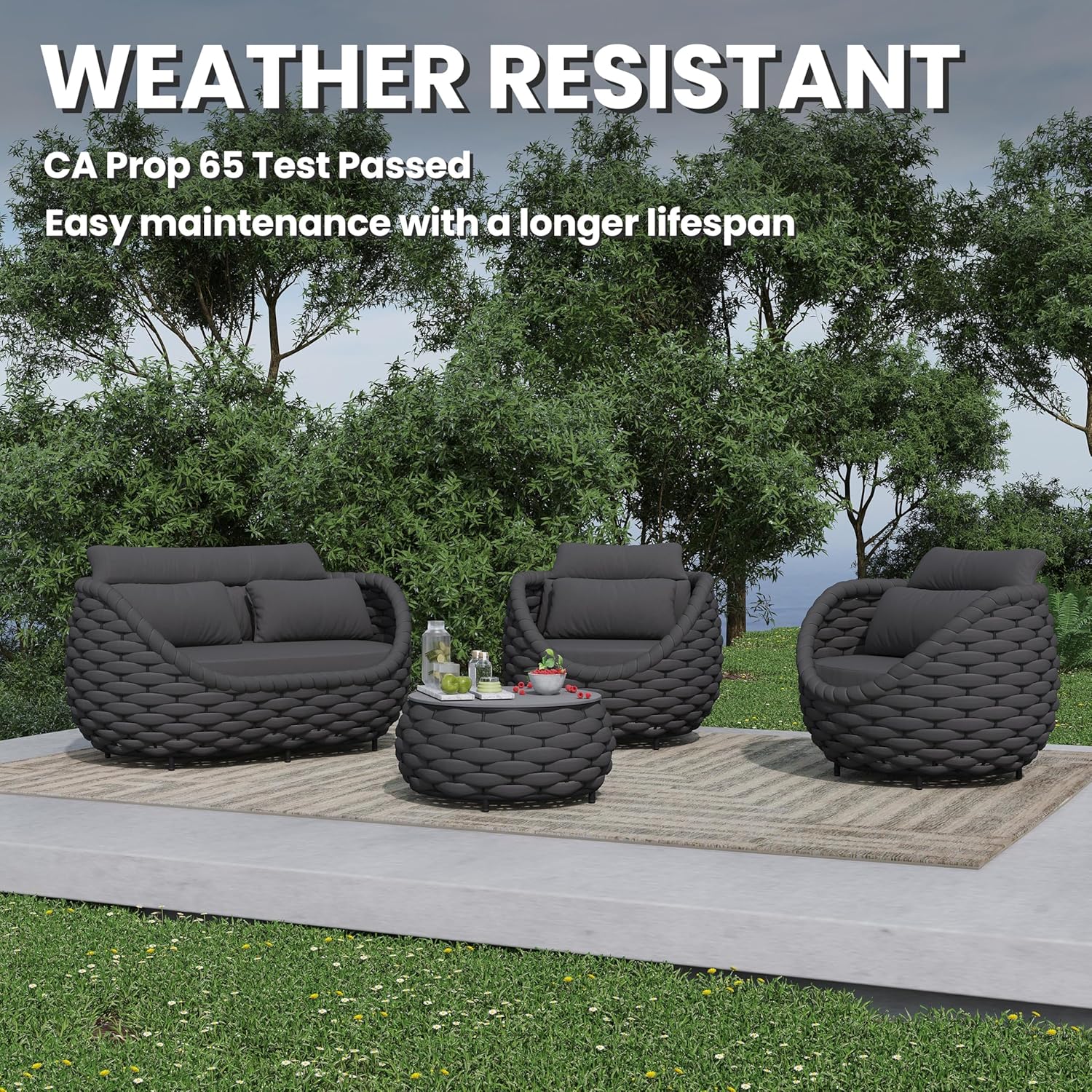 - Furniture crafted from reinforced rust-resistant aluminum frame, wrapped in Textilene hand woven rope. The outdoor patio conversation set is weather resistant to UV, rain, wind, salt water. Perfect for indoor outdoor even arid or coastal areas