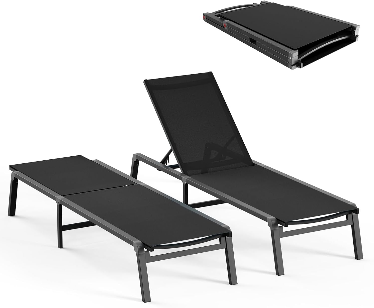 Patio Chaise Lounge Chair, Foldable Lounge Chair for Outside, Aluminum Chairs Set of 2 with 5 Adjustable Backrest, Outdoor Pool Lounger for Poolside, Lawn, Deck, Black