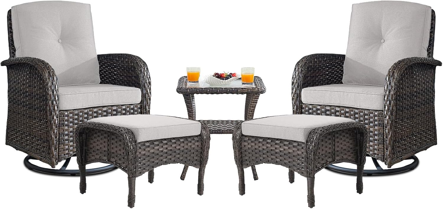 - 4.LUXURIOUS OUTDOOR RETREAT ENSEMBLE: Relax in the beautiful outdoors with this perfect 5 pieces patio furniture set. Our patio swivel rocker chair set with high quality foam cushion, comfortable and soft rebound good. The cushion cover is made of olefin outdoor water-resistant fabric. The seat and backrest are made of beautifully woven wicker coupled with ergonomic design, making it a classic upgrade for any porch, deck or patio.