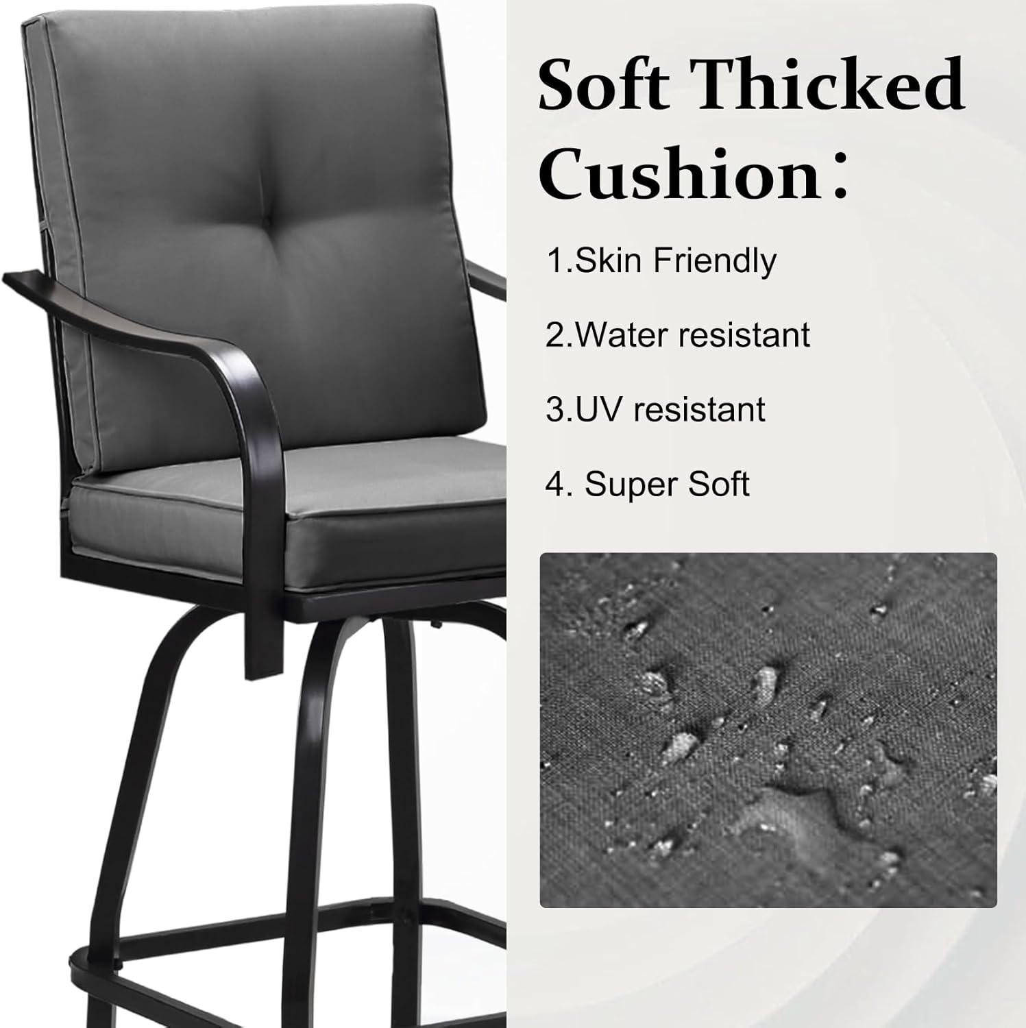 - Multiful Purpose: This patio swivel bar chair has an simplistic overall style to fit most decoration or settings. Sturdy iron frame with padded cushion made this patio bistro set perfect for both outdoor and indoor usage