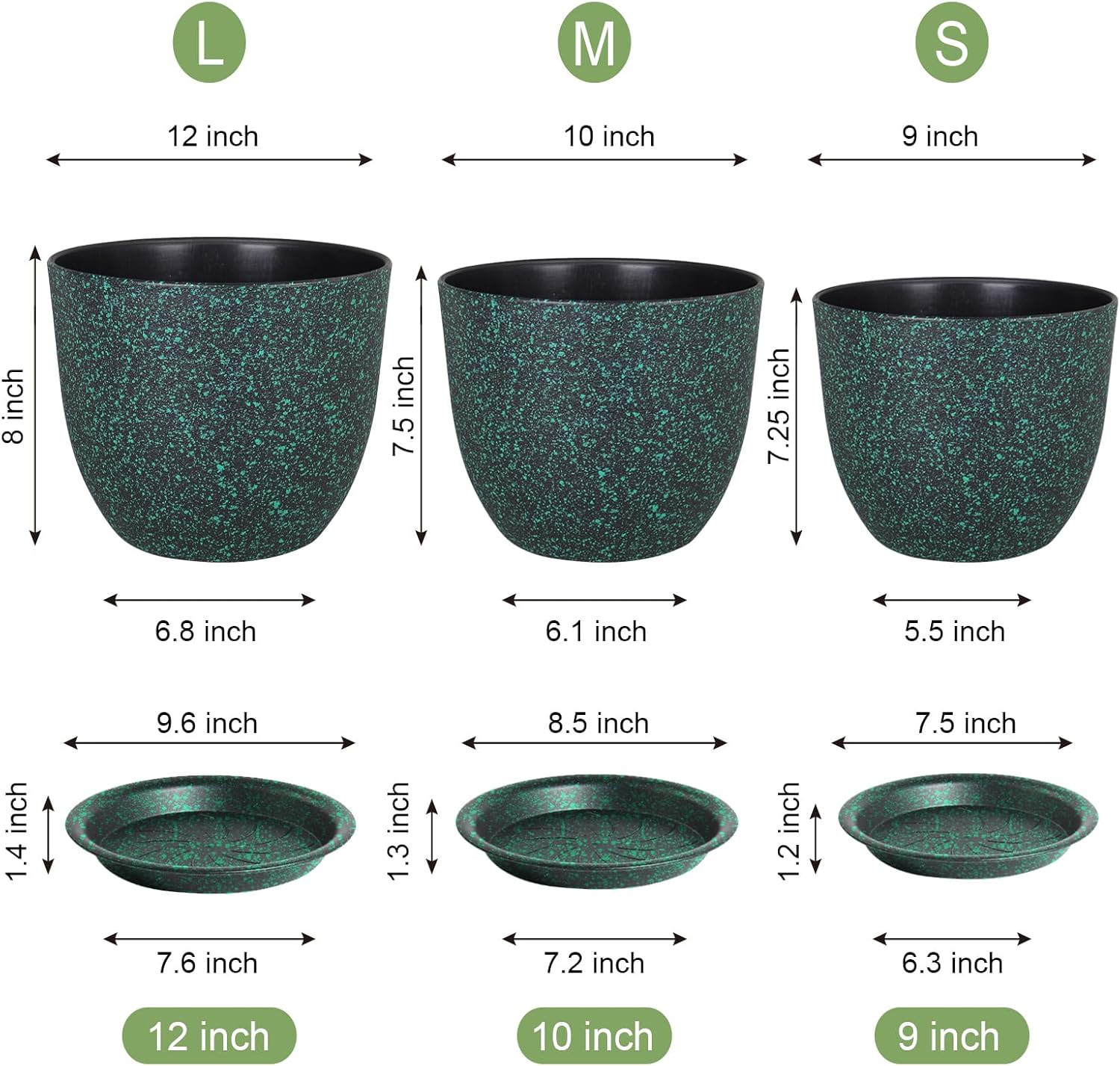 Large Flower Pots 12/10/9 inch, Set of 3 Decorative Plastic Planters with Drainage Holes and Saucers for Garden House Plants, Plant Pots for Indoor Outdoor Plants, Black with Green Speckles