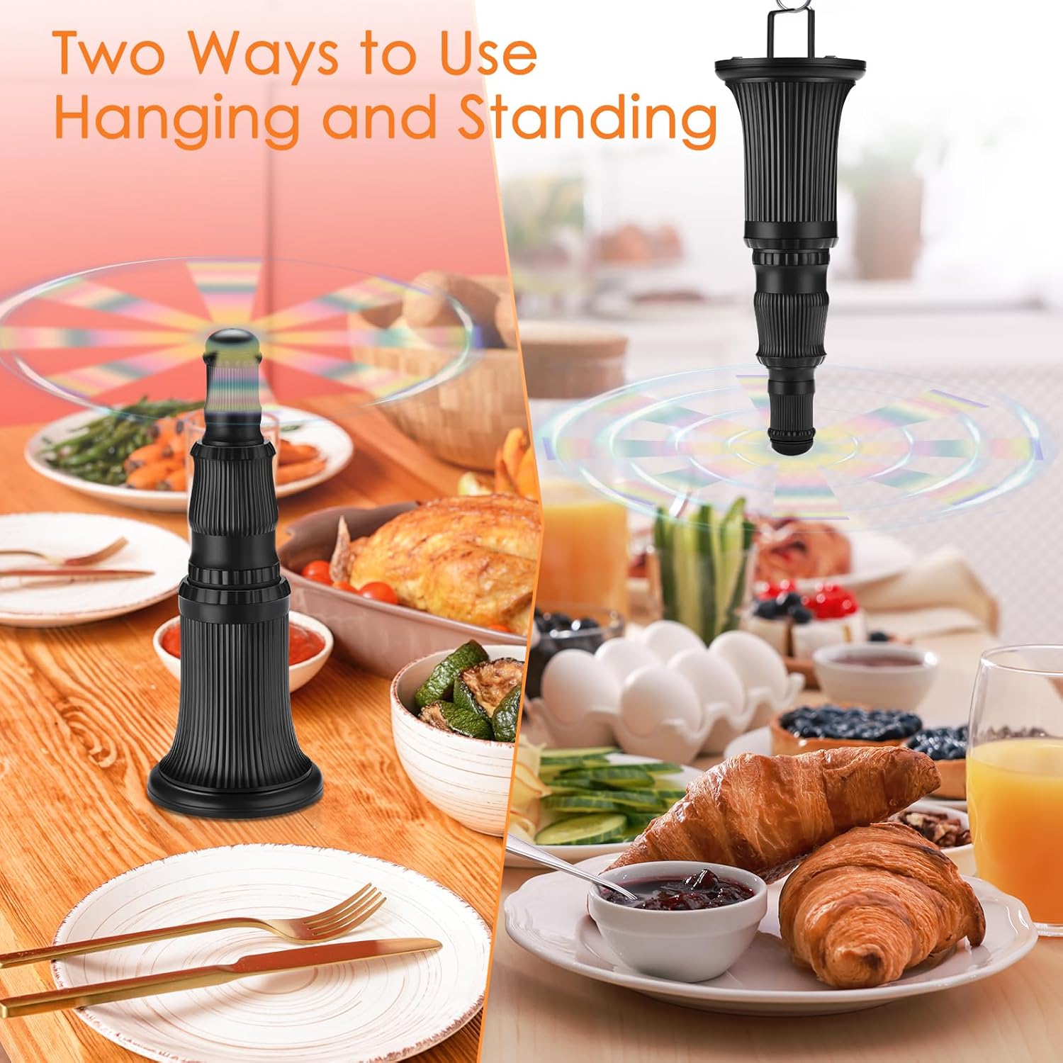 - 【Upgraded Reflective Fan Blades】This fly fans for tables have holographmatic dots on the blades.The holographic pattern on the blade refracts light as it rotates,creating an unnatural environment for insects to fly away from,and bugs and flies to avoid and stay away from your area,which effectively protect your food and drinks from flies.