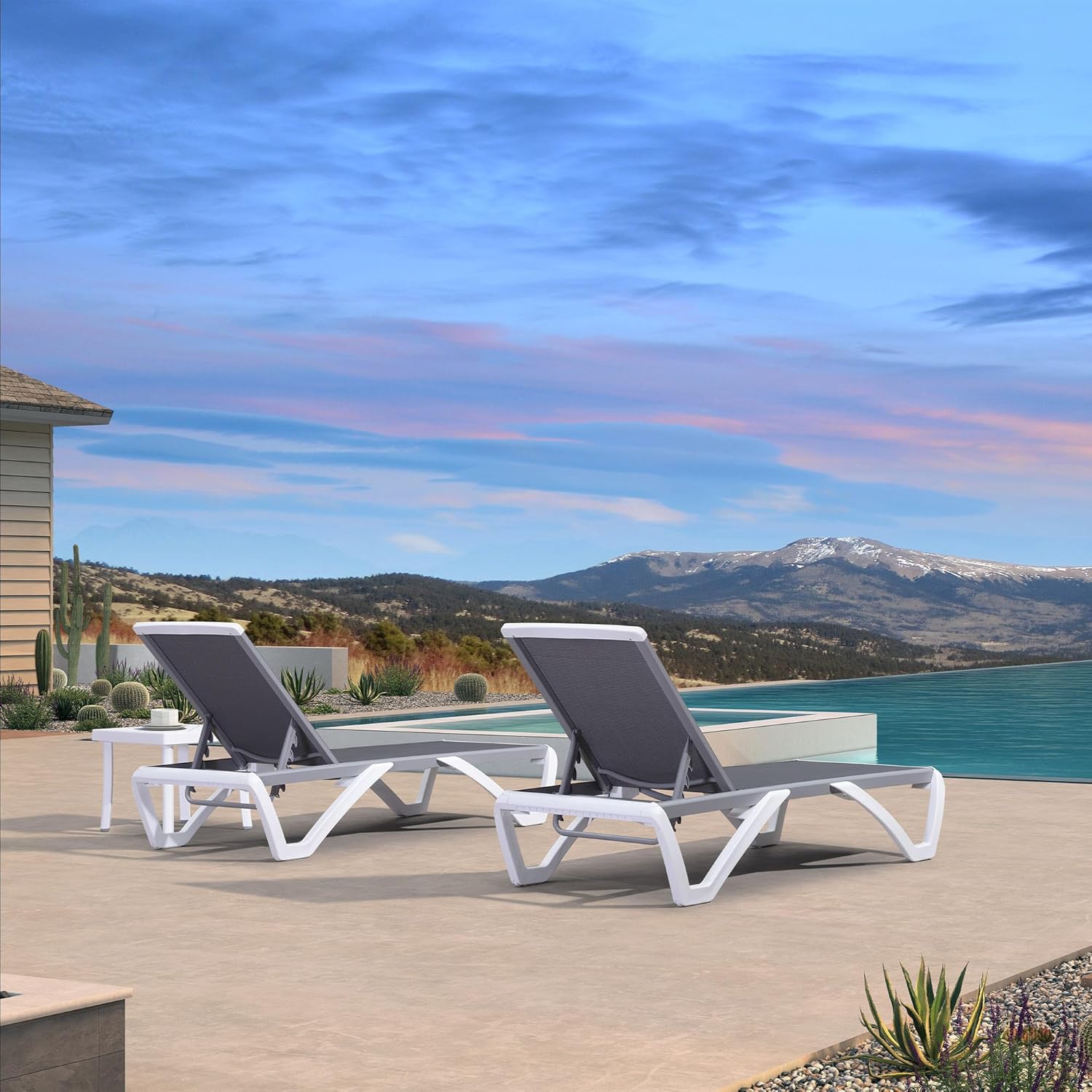 - Packages include 2 chaise lounge chairs and 1 side table.