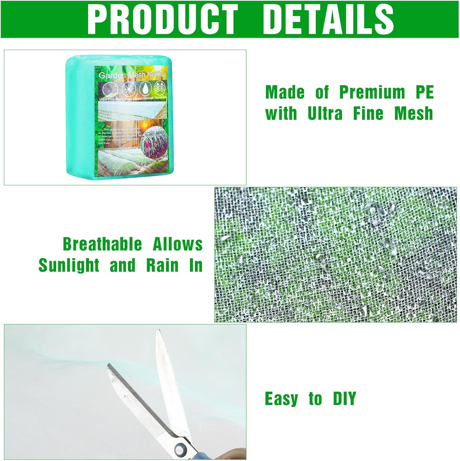 - Quality Mesh & PE Material: Made from durable mesh cloth combined with polyethylene, this garden mesh netting is waterproof, flexible, and built to resist wear and tear; It holds its shape over time, providing long-lasting coverage you can rely on in various outdoor conditions