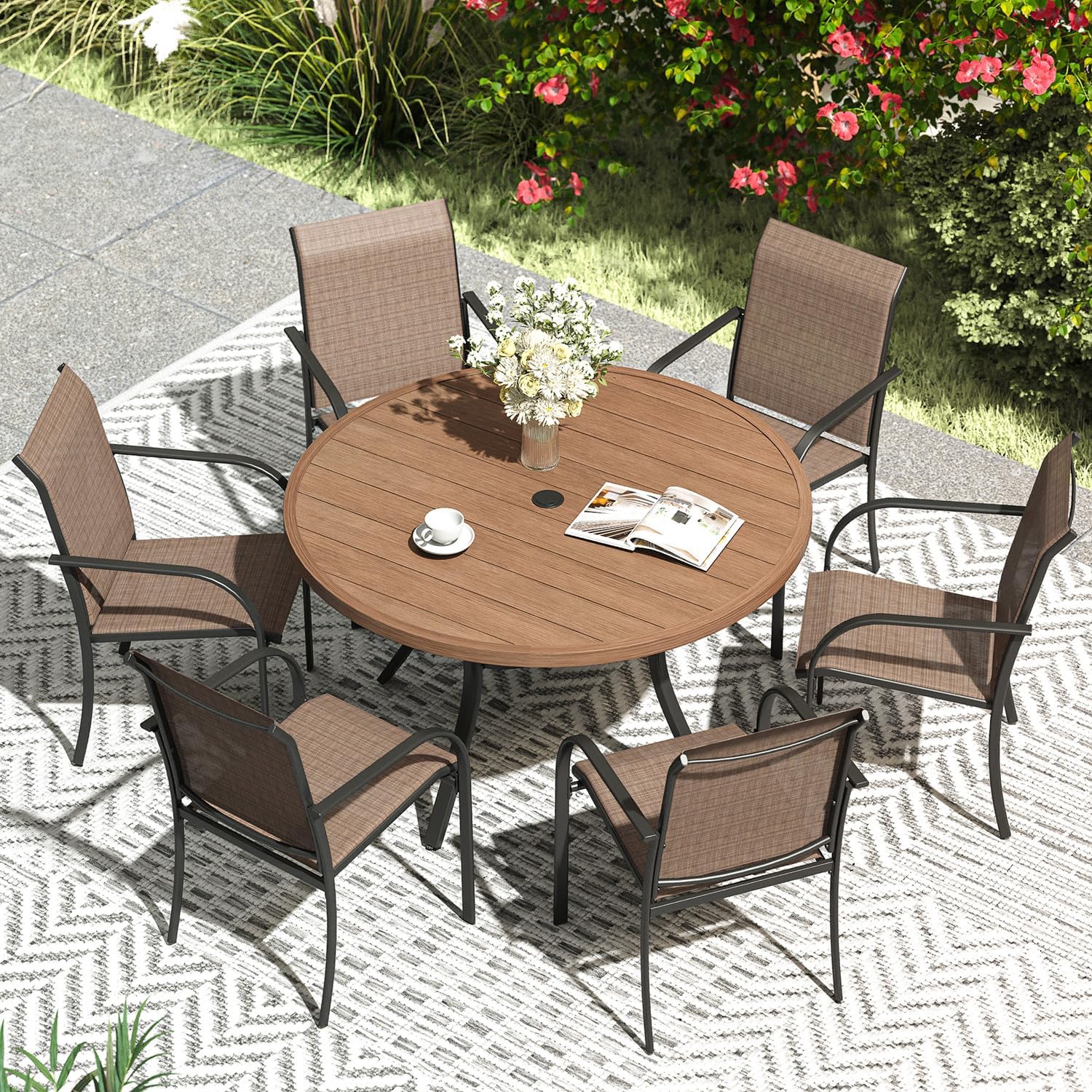 VICLLAX Patio Dining Set for 6, Outdoor Furniture Set Includes 47.2" Round Patio Table and 6 Patio Sling Chairs, Walnut Tabletop and Brown Fabric