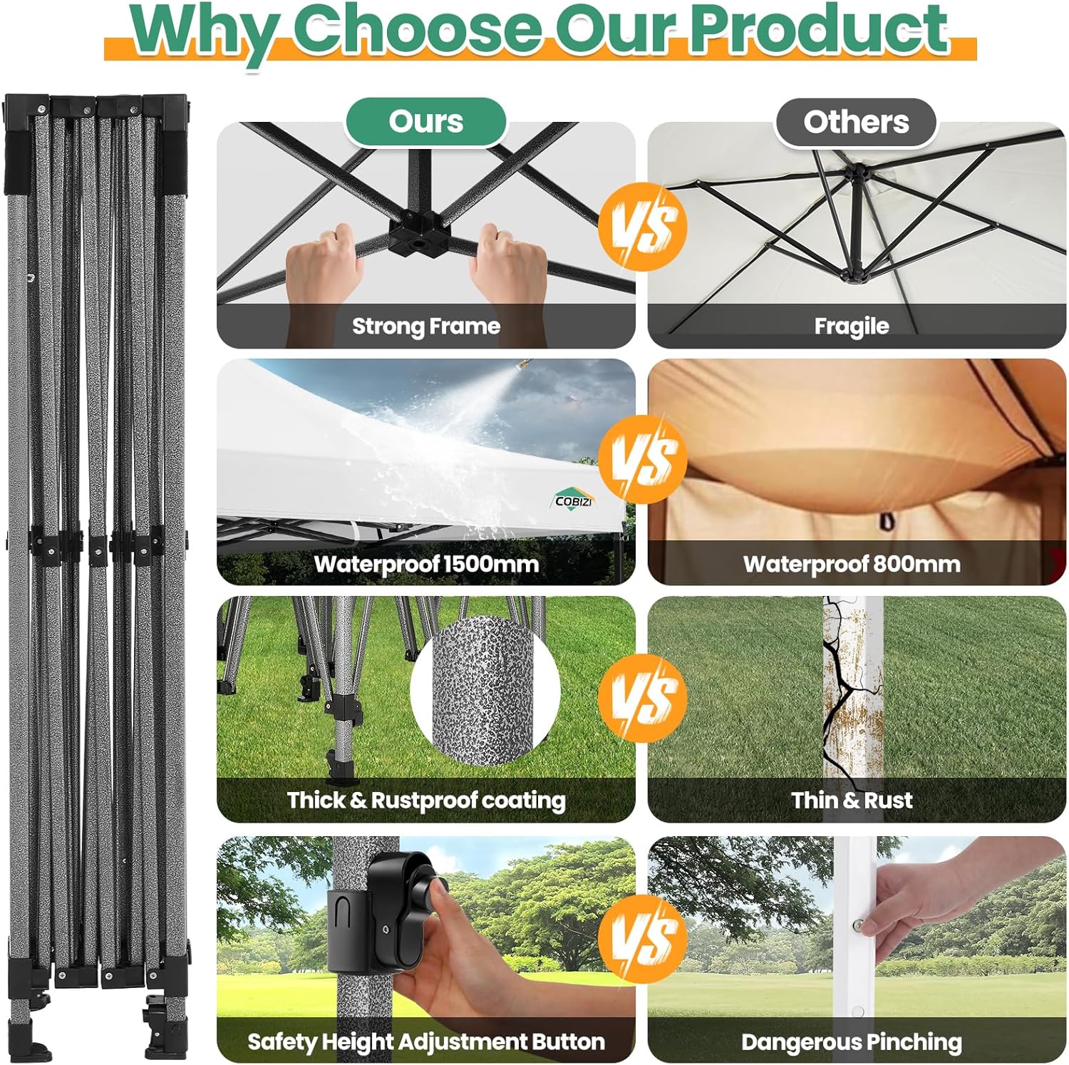 - 【Waterproof & Windproof Premium Material】COBIZI 10x15 Pop up Canopy is made of 420D Oxford fabric (280gsm) with two layers of PU coating, UPF 50+, blocking 99% of UV rays. All seams are taped and pressed to prevent leakage, 101% waterproof. Cobizi canopy has excellent performance and helps to withstand harsh weather
