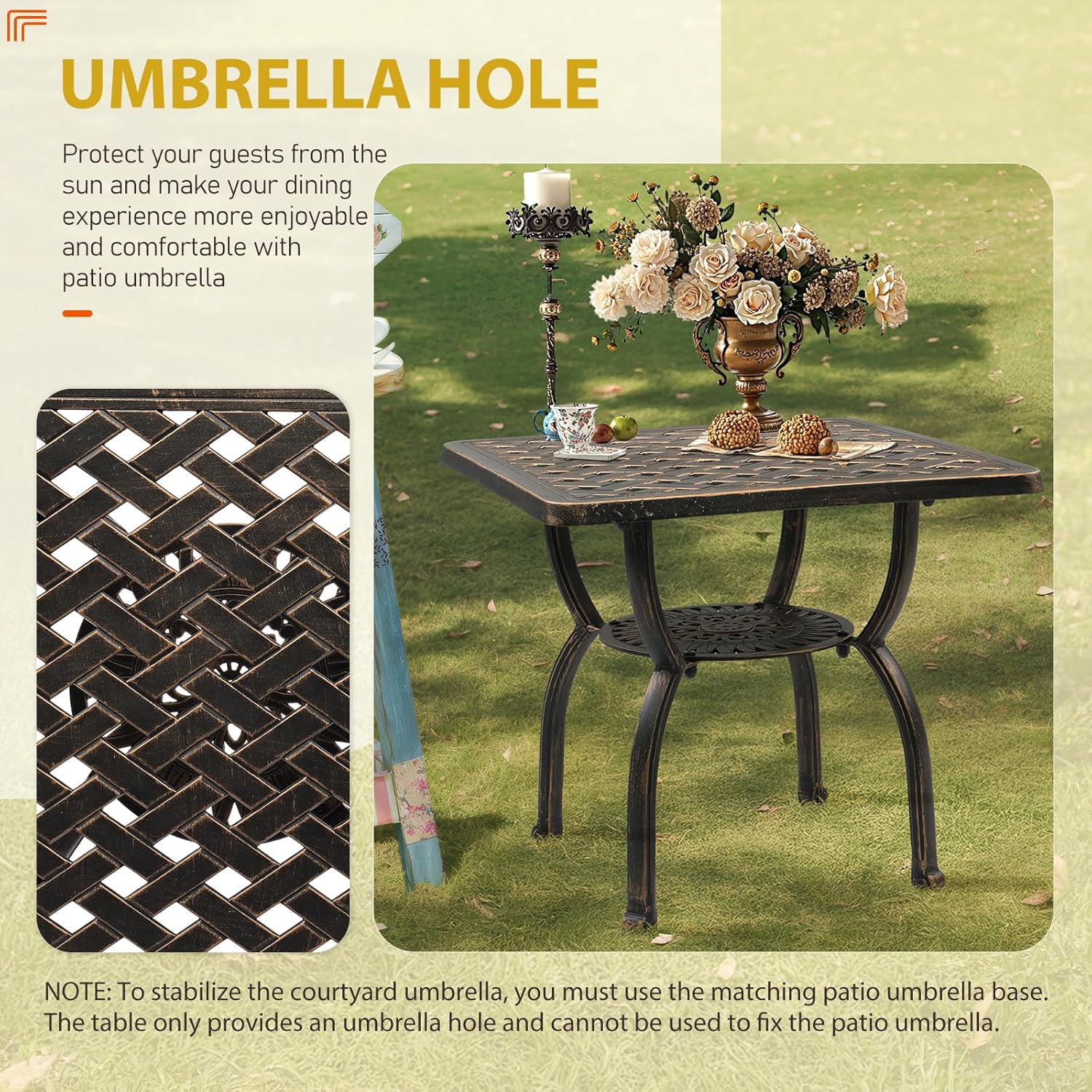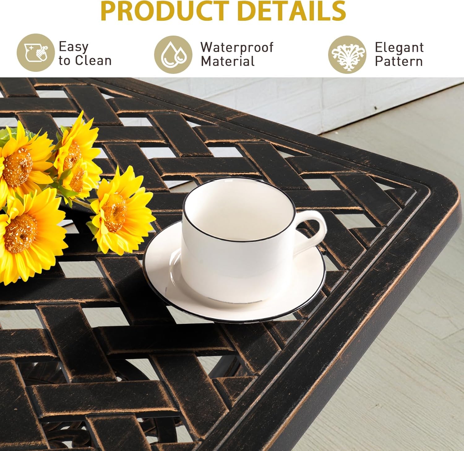 - PREMIUM CAST ALUMINUM: Crafted from high-quality cast aluminum, this square bistro table is built to withstand the elements. With exceptional durability, weather resistance and rust-proof features, it ensures long-lasting outdoor enjoyment with minimal maintenance required