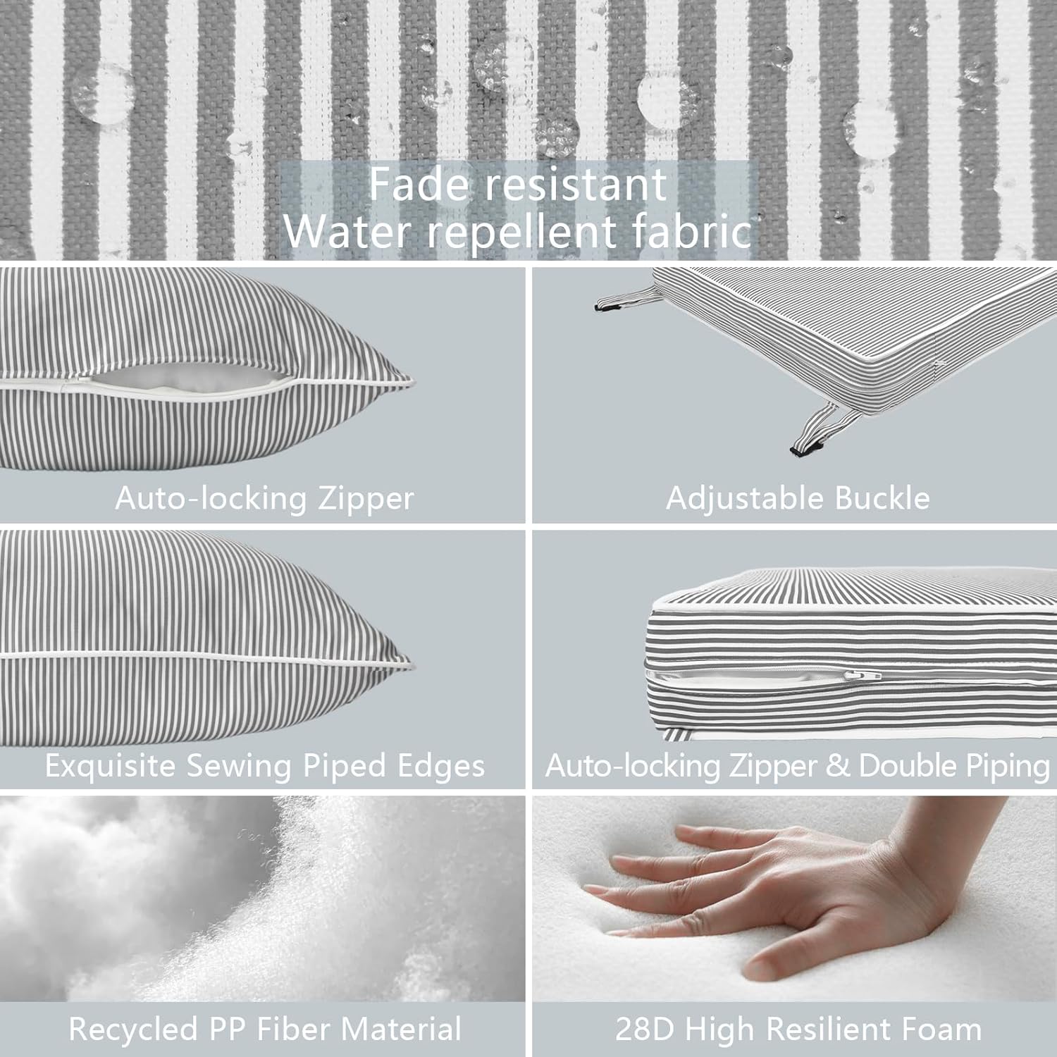 - ⭐Material: Made of 100% durable polyester fabric and soft filling material. It’s water repellent and fade-resistant. Won’t fading under the direct sunlight over 500 hours. Cushions are filled with 28D high resilient foam, overstuffed construction for enhanced comfort and longevity.