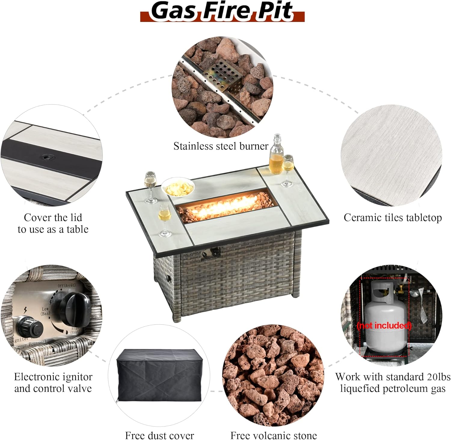 • FirePit Table Included: Comes with a square convertible propane gas fire pit table. Night time use it as a fire pit table to add atmosphere. Day time use it as a tall Dining table with the burner lid. Stainless Steel Burner withstands all weather. CSA certificated for safety.