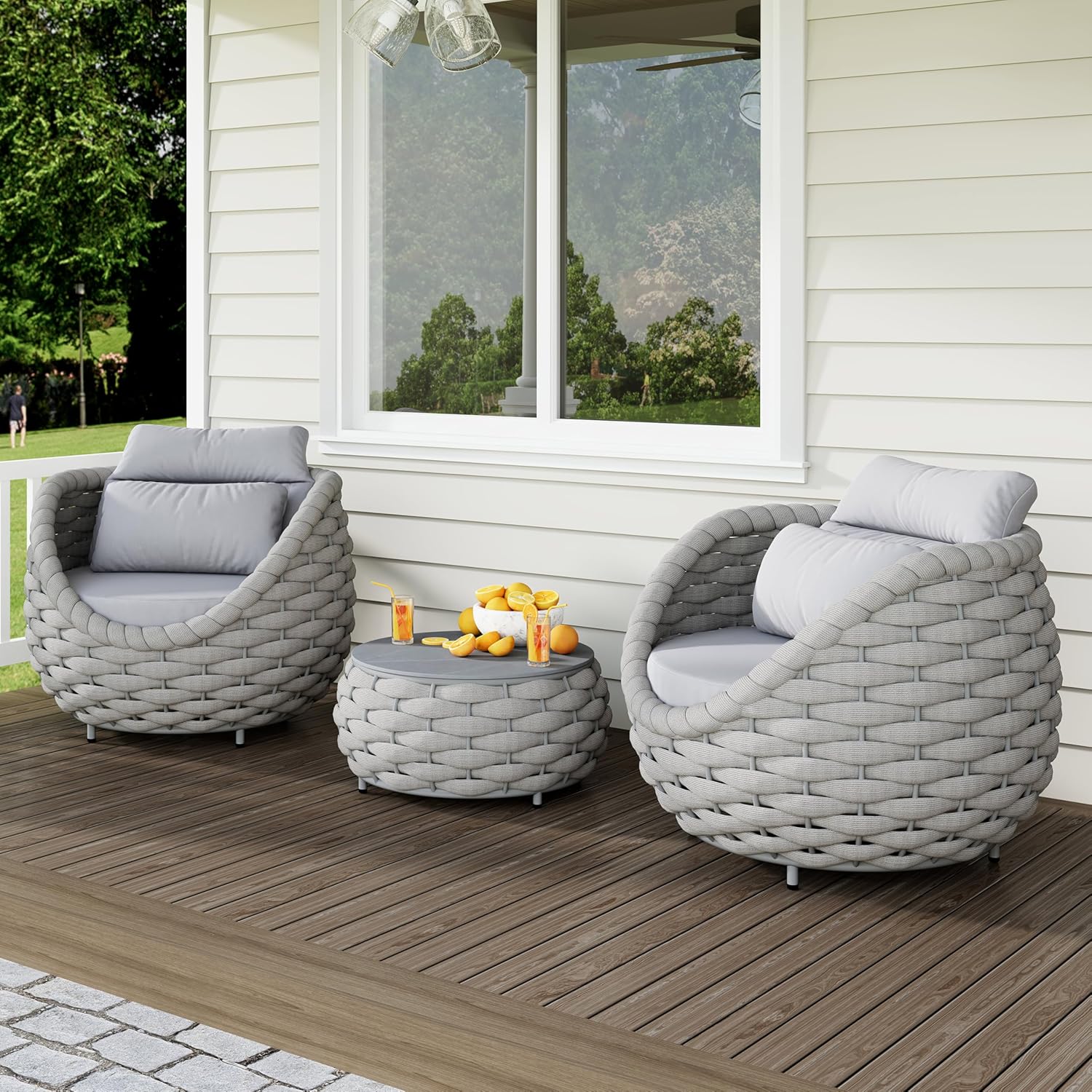 - Furniture set is crafted from reinforced rust-free aluminum frame, wrapped in Textilene hand woven rope. The 3 pieces all weather patio upholstered conversation set resists to UV, rain, wind, salt water. Perfect for indoor outdoor even arid or coastal areas