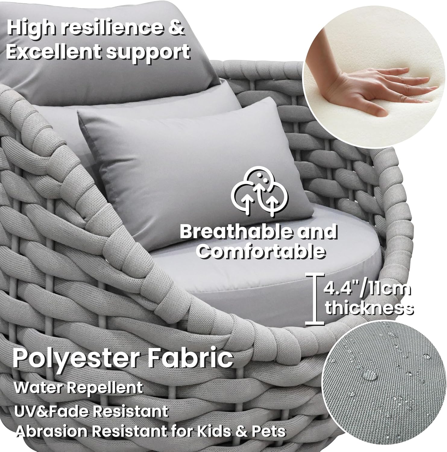 - Filled with 4.3"/11cm thick high-density sponge and cotton, cushions are soft touching and breathable for a refresh comfy patio seating holding its shape. Water repellent and abrasion resistant polyester fabric also fits families with kids and pets