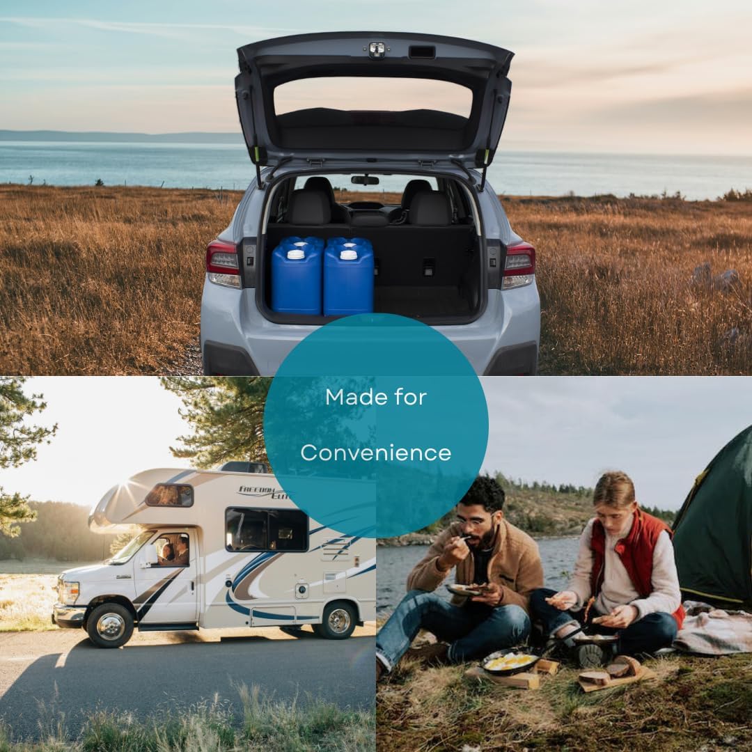 - IDEAL FOR TRAVEL & EMERGENCY STORAGE: If you’re looking for a reliable water container for emergency storage, camping, boating, or beach trips, or even for a watering station for an outdoor event, this kit is exactly what you need. The handle on each 5-gallon container makes it a breeze to transport, and it can easily stack in the back of your car or truck for road-tripping adventures.