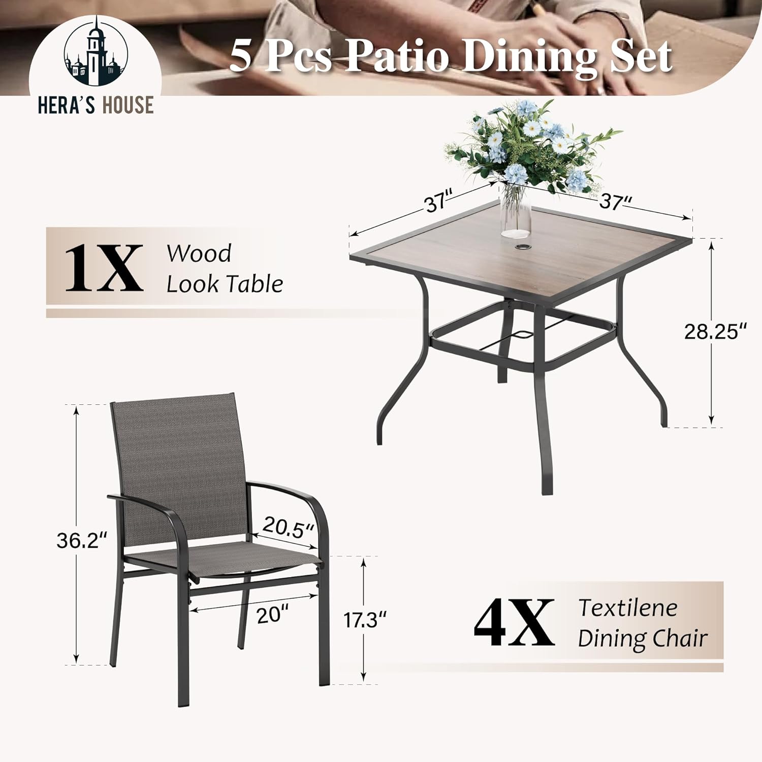 - ăA REAL PRACTICAL PATIO DINING SETă This dining set including 1x 37" square table and 4 x textilene chairs. Perfectly fitting with your backyard, poolside, balcony, garden and deck to create an outdoor comfort zone. Perfectly meet the requirement of enjoying outdoor leisure time like a meal or host a party with your family or friends.