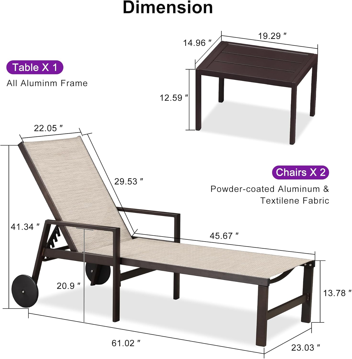 PURPLE LEAF Pool Lounge Chairs Set of 3 Aluminum Outdoor Lounge Chairs with Wheels and Armrests Adjustable Patio for Deck Outside Lawn Garden, Beige