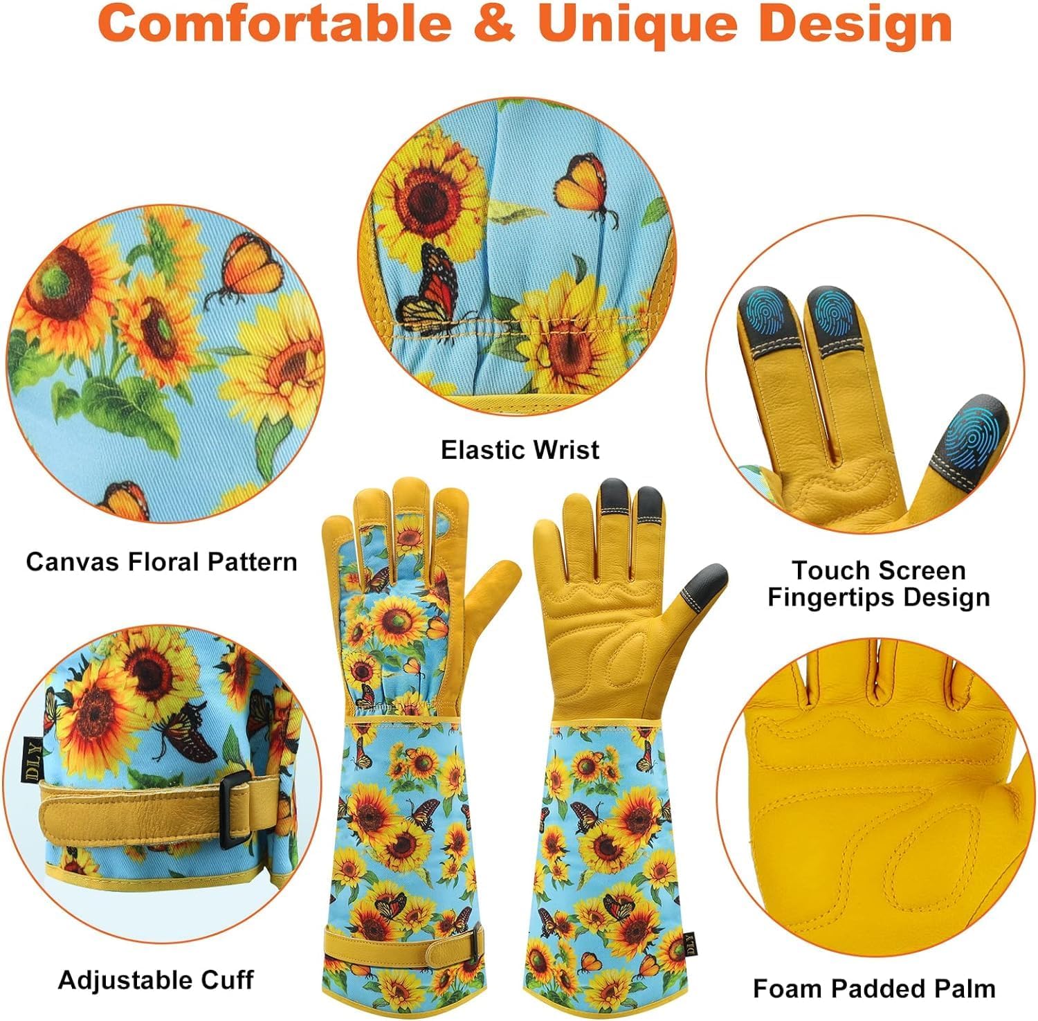 - High Quality Gardening Gloves:The palms and fingers of gardening gloves for women are made of high-quality 100% cowhide leather.The palms with foam pads to ensure abrasion resistance and grip. The back of the hand and forearm are made of breathable and sweat-absorbent canvas material with bright floral patterns, which are breathable, and comfortable.