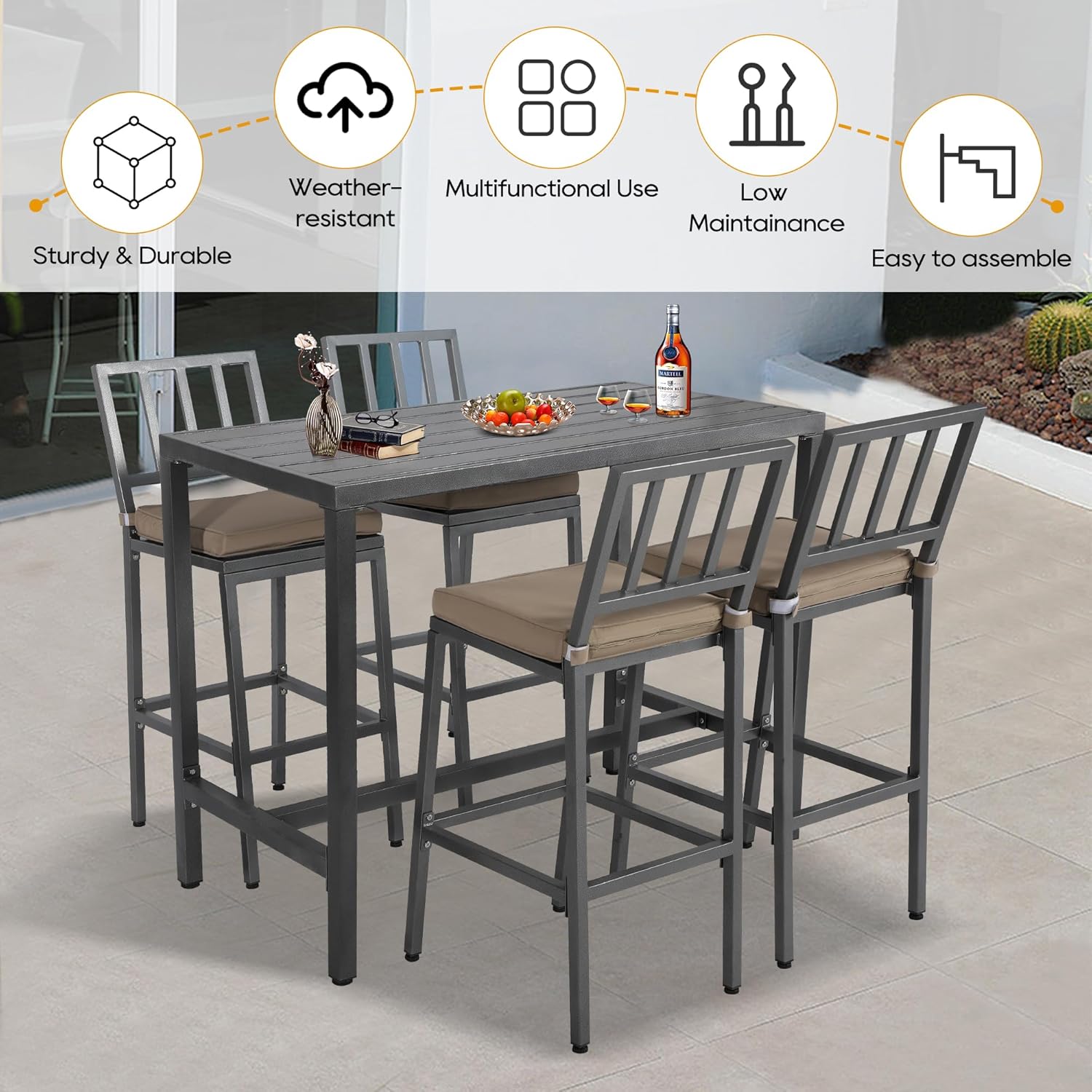 - Space-Saving Design: The bar height patio dining set is ideal for small space, and can be placed for corner. When the bistro bar set is not in use, the 4 bar stools could slide under the table, which could save your space