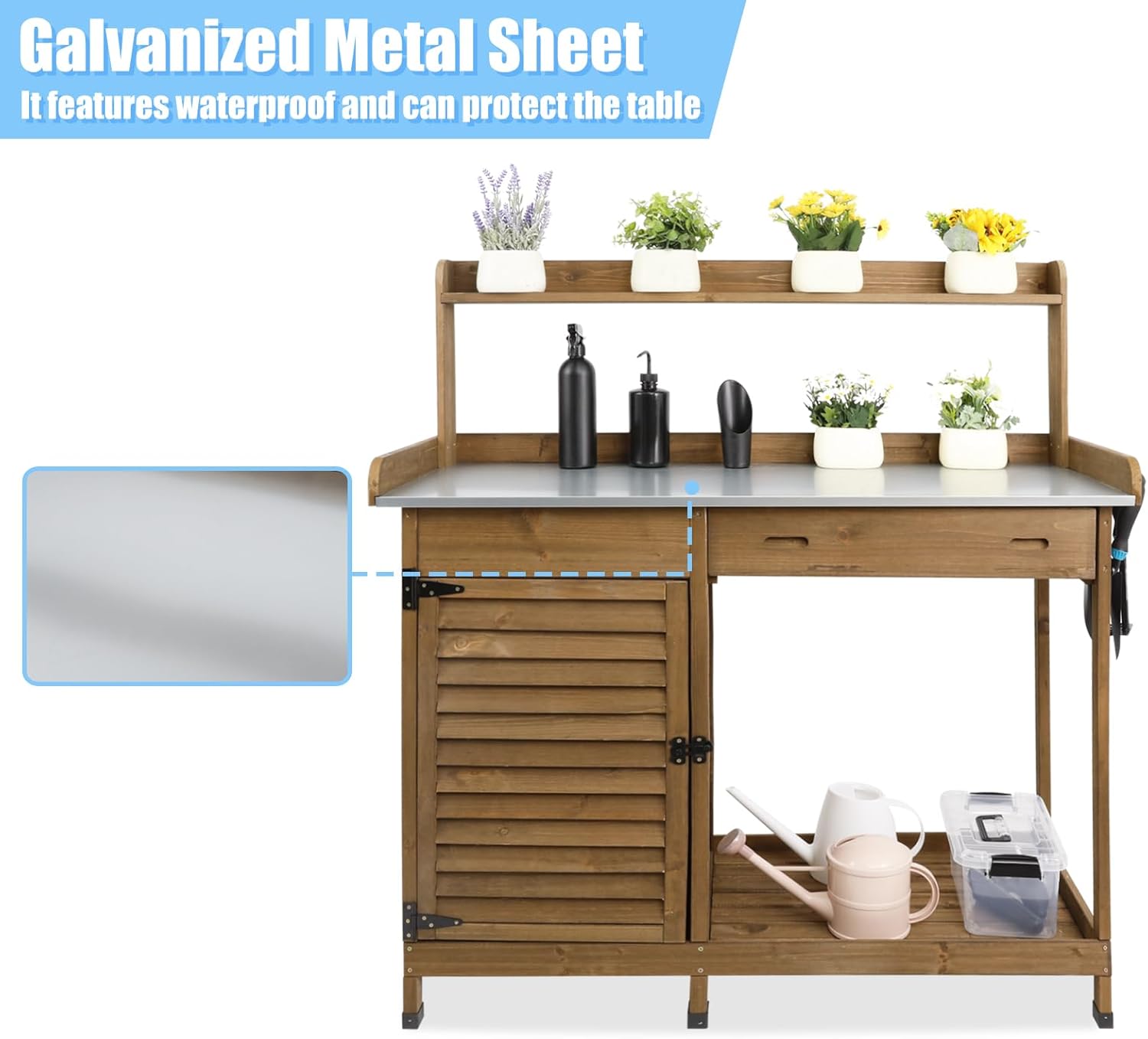 Outdoor Garden Potting Bench Table, 41" L Wooden Potting Table Work Bench for Horticulture, Waterproof Workstation Table with Metal Tabletop/Cabinet/Drawer/Open Shelf (Brown)