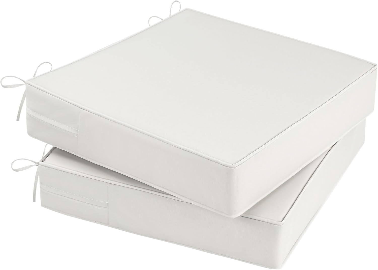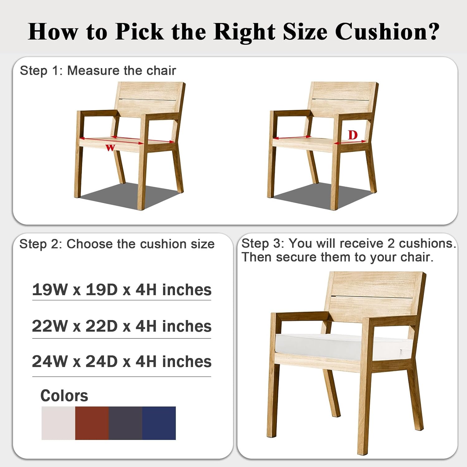 - PERFECT SIZE: Outdoor chair cushion set includes 2 cushions. Cushions measure: 24 inch (W) 24 inch (D) 4 inch (H). Fits most standard size outdoor chairs. Since the outdoor cushions are vacuum-packed, it may take 24-48 hours for the cushion foam to fluff back up after opening the vacuum bag