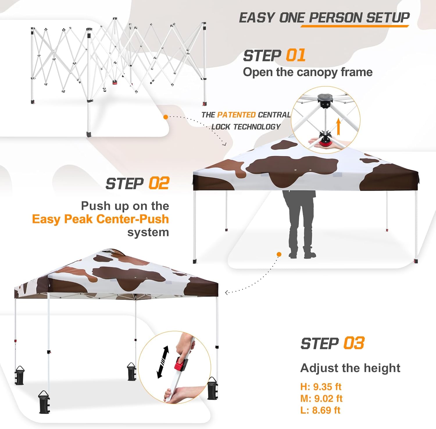EAGLE PEAK Pop Up Canopy Tent with Wheeled Carry Bag, 8 Stakes, 4 Ropes, 4 Weight Bags, Easy Set Up Tent Canopy, 10x10 ft, 100sqft of Shade, Brown Cow Print