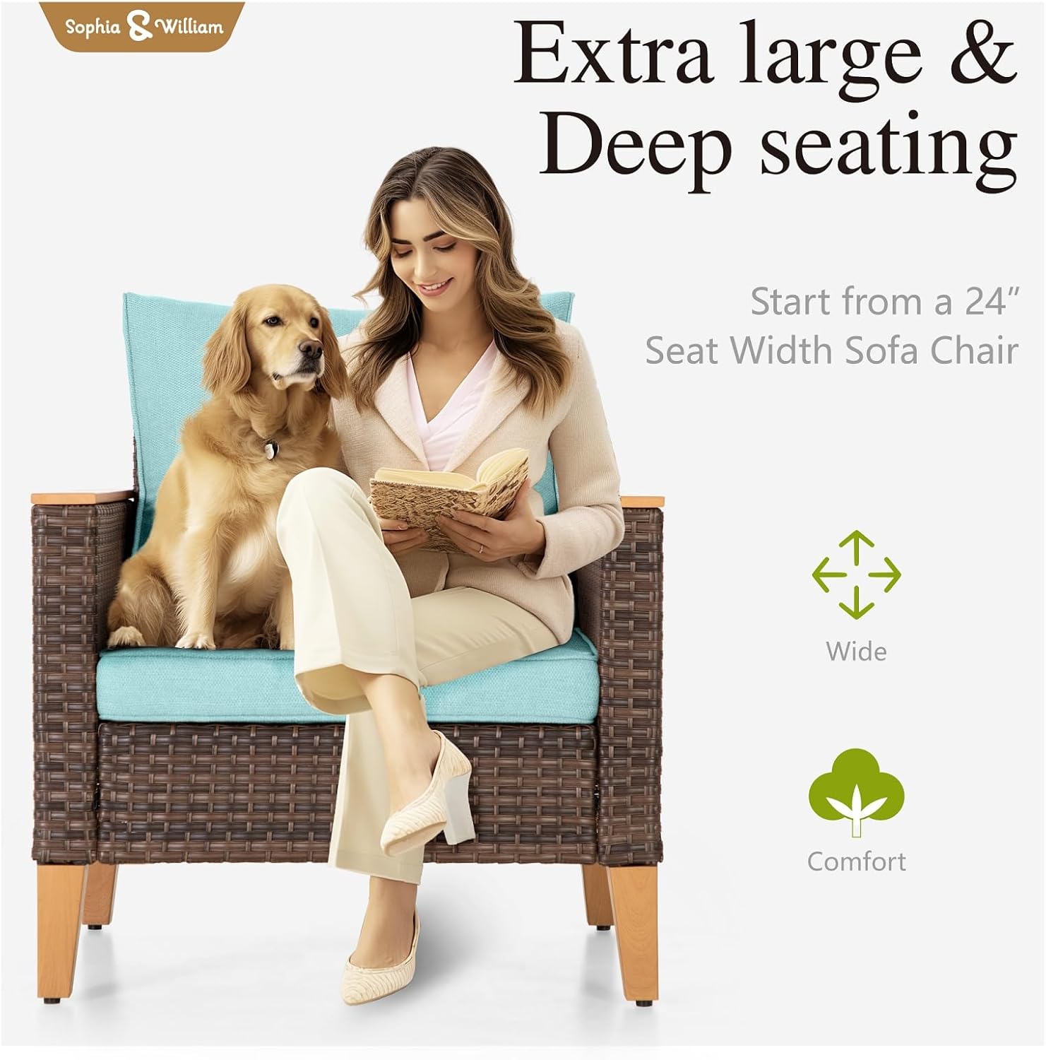- LUXURIOUS COMFORT AND DURABILITY: This outdoor furniture set offers luxurious comfort and durability. Its 4-inch thick cushions and spacious seating area provide a perfect balance of softness and support, allowing you to relax for hours. Each seat can support up to 350lbs, ensuring both comfort and durability