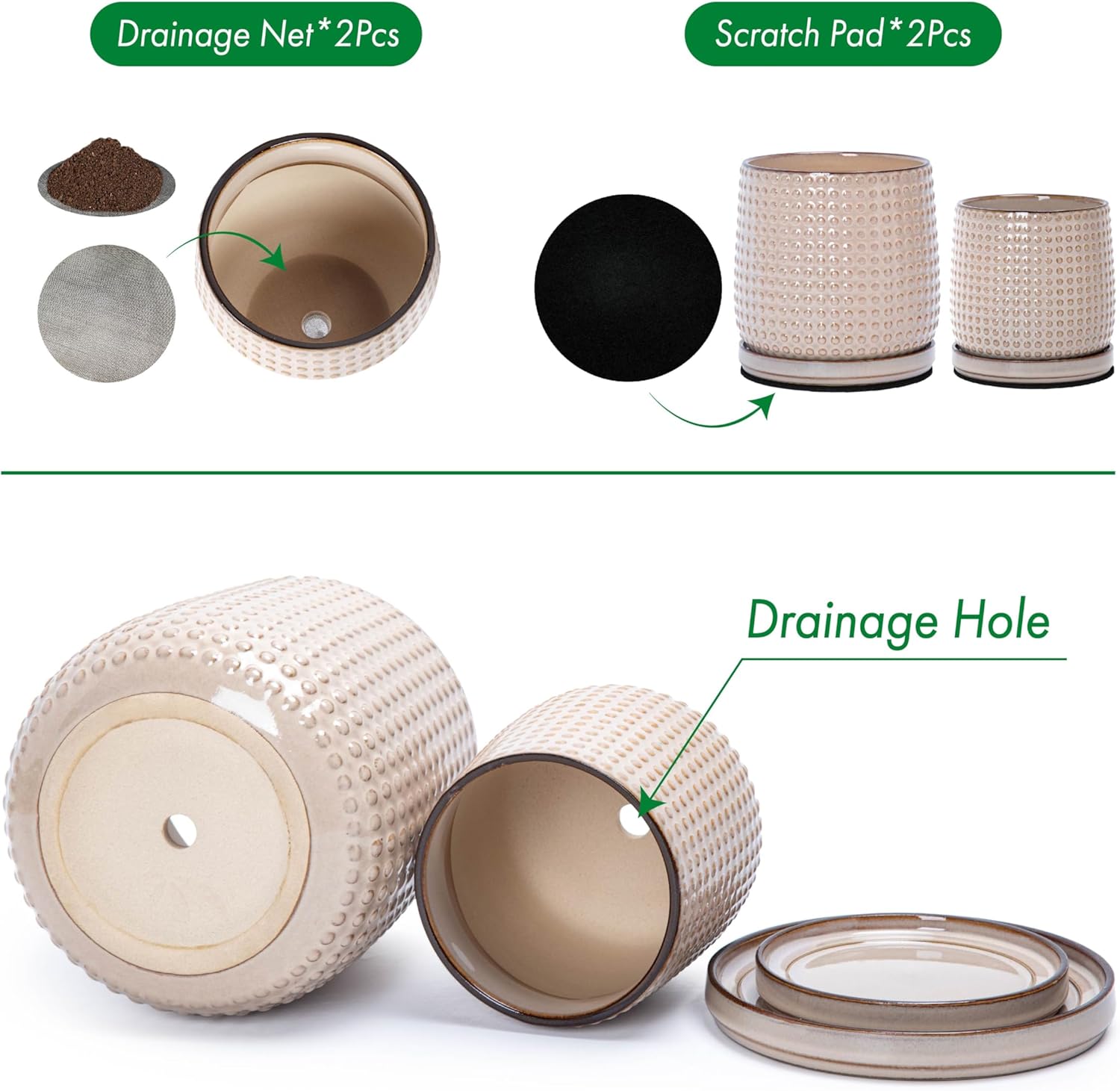 - Drainage Net and Pad: A drainage net is also included to prevent soil from falling off the pot. Another protective pad is included to protect tabletop wood surface from scratches.