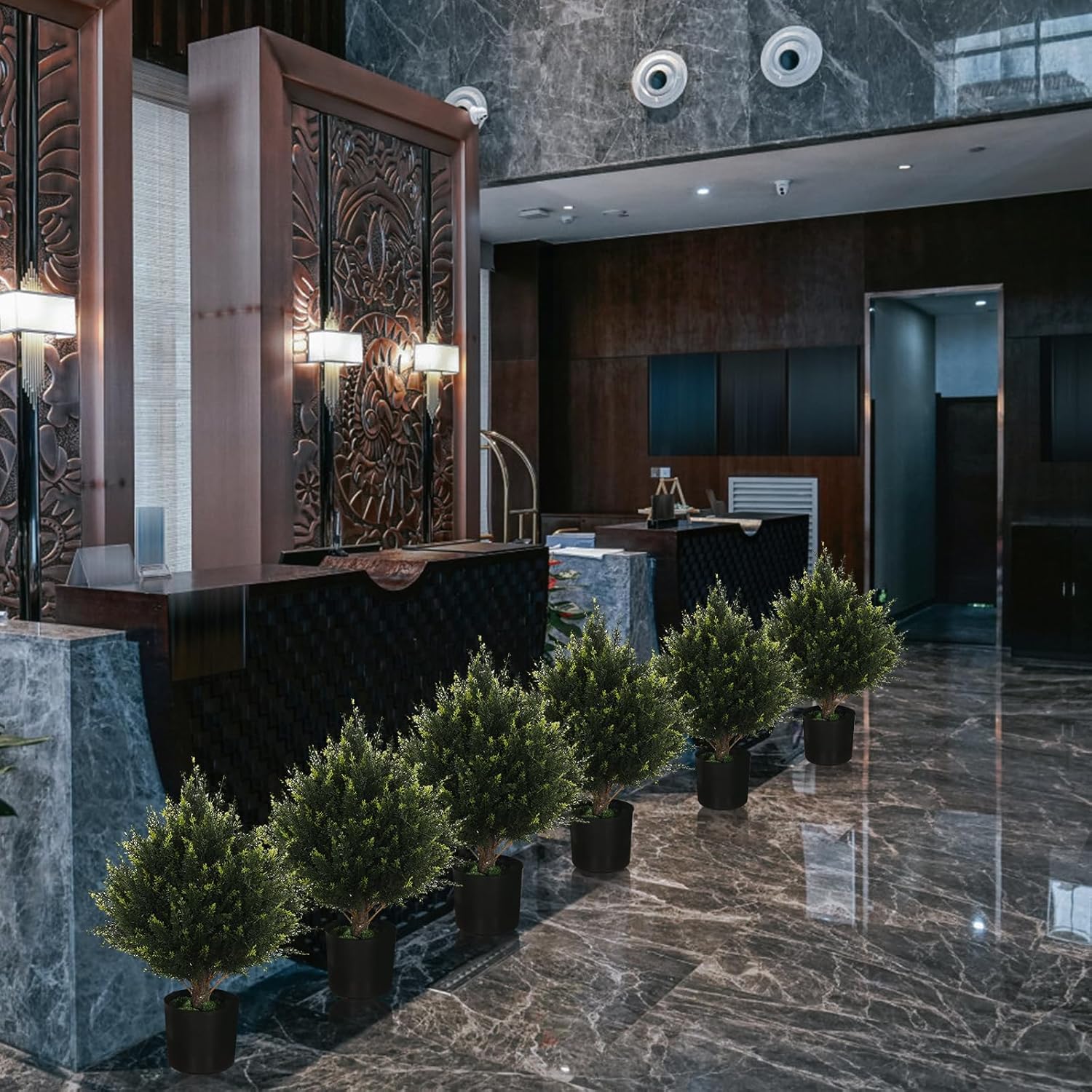 - Product size: The topiary trees artificial indoor in outdoor is19”*13”*13”, provided with a black plastic flowerpot with 4.5 inches height and 5 inches width. The height of cedar is measured from the bottom of flowerpot to the leave atop the cedar, and the width of cedar is measured from the leftmost leave to the rightmost leave,The products are made manually. It is normal to have 1 inch error in measurement. Please be prudent in buying if you mind it