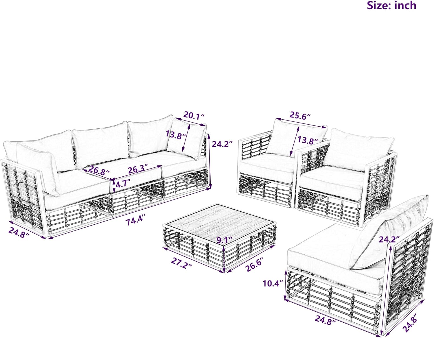 - ๐[Easy Assembly] - Each order comes with a clear and detailed assembly instruction guide and all necessary tools are provided to get your set assembled in no time. If you have any questions, please feel free to contact us, we will reply you as soon as possible. Single Sofa: 24.8x24.8x24.2inch(LXWXH); Coffee Table:27.2x26.6x9.1inch(LXWXH); Seat Cushion:26.8x26.3x4.7inch(LXWXT); Back Cushion๏ผ25.6x13.8x7.1inch(LXWXT); Side Pillow: 20.1x13.8x7.1inch(LXWXT).
