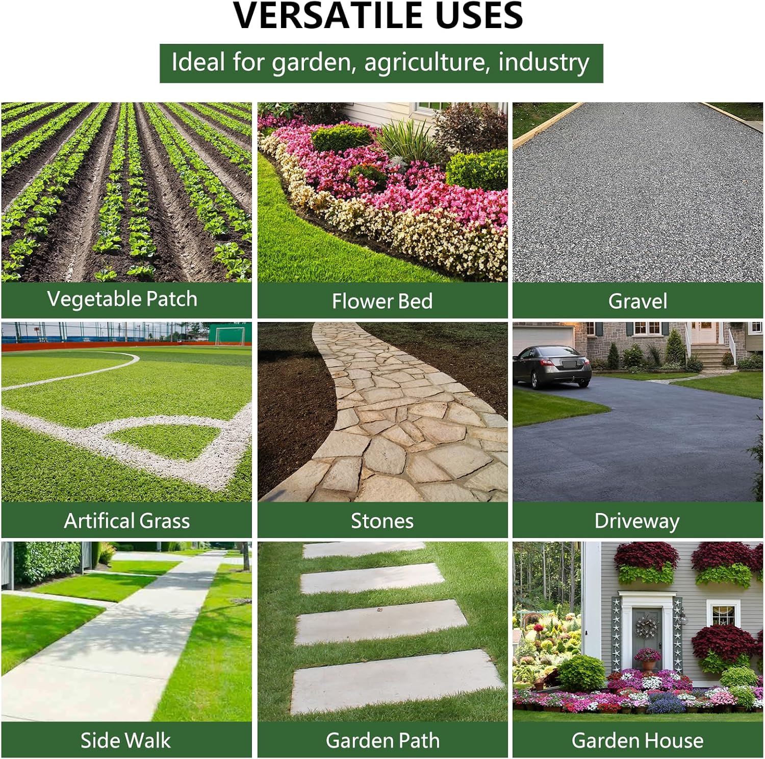 - Wide Application: Our durable garden weed cloth will keep annoying weeds away from your garden. The weed mat fabric is ideal for garden, agriculture, industrial uses, such as a greenhouse, vegetable patch, flower bed, artificial grass, sidewalk, gravel, driveway, stones, etc.