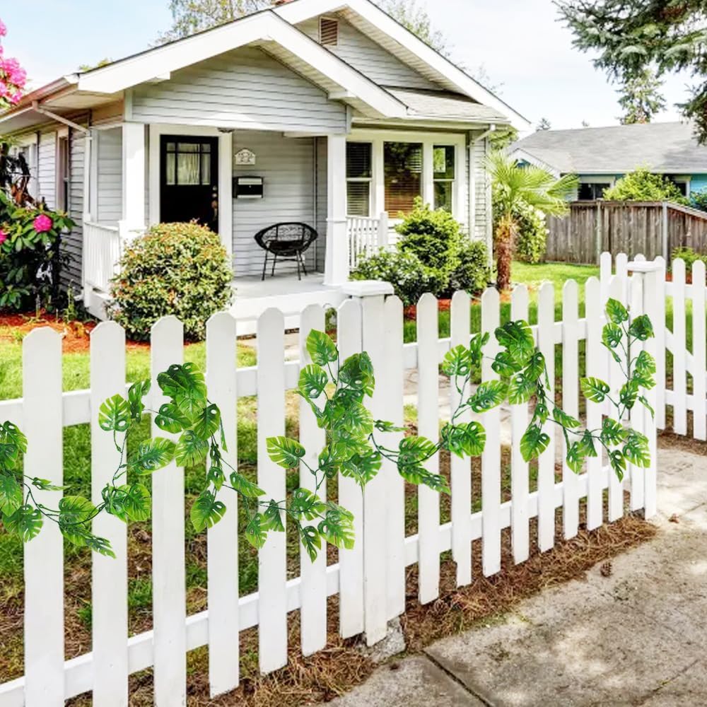 - Monstera Leaves Vines Size & Packaging: Package includes: 2 packs of artificial hanging monstera leaves vines and 4 hooks. Each monstera vine is 5.9 ft/180cm long and each monstera leaf appr. 3.5"x 2.7"(LxW), about 54 fake green leaves per Monstera Leaf Vine. Each monstera vine is equipped with 2 hooks. NOTE:Due to packaging and transportation, the leaves maybe dropped, you can insert the leaves back after opening the rattan.