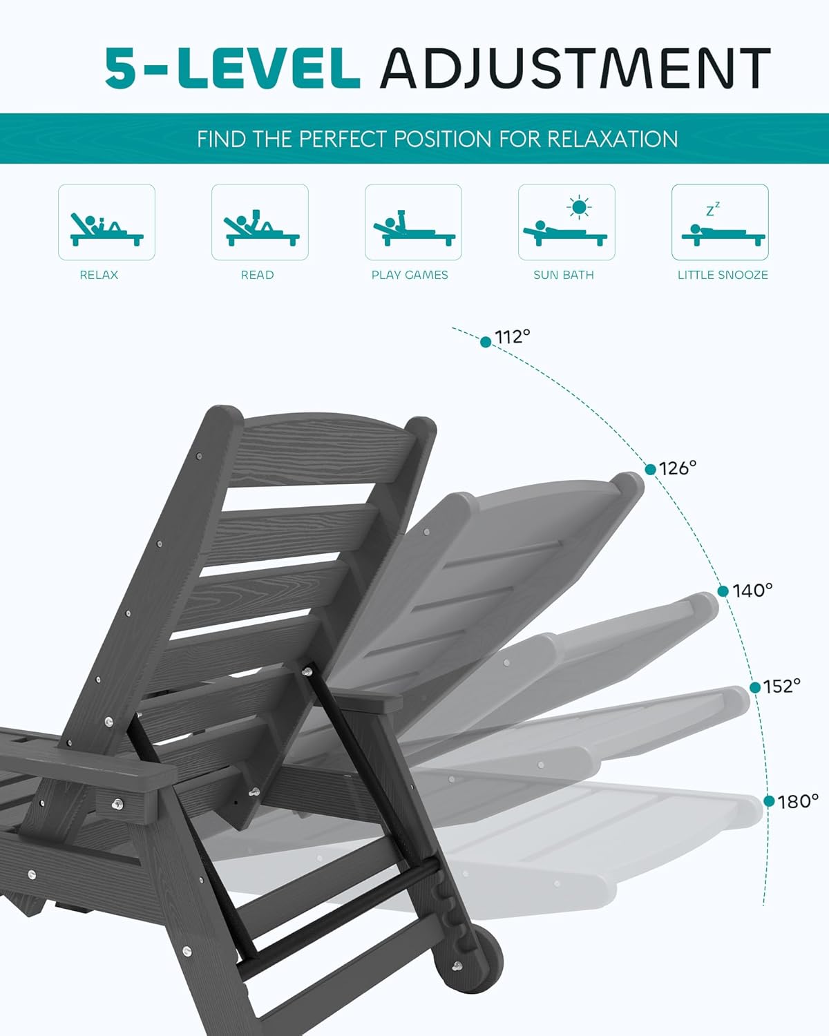 - 5-Position Adjustable Backrest: Our patio lounge chair offers a versatile 5-position adjustable backrest, allowing you to find the perfect angle for ultimate relaxation. Whether you want to read, nap, or soak up the sun, you can easily adjust the backrest to suit your needs.