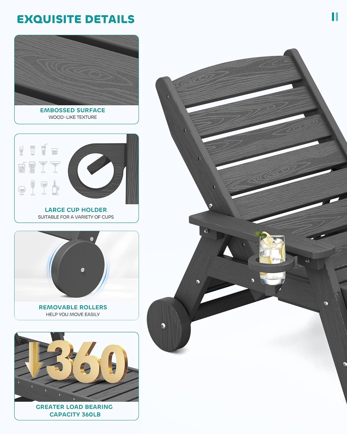 - Rolling Wheels: Equipped with convenient wheels, our chaise lounge chair is effortlessly portable. You can easily move it around to follow the sun or find shade throughout the day, providing you with the flexibility to create your ideal lounging spot.
