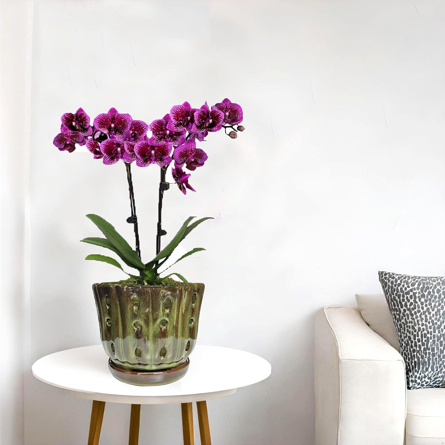 Ceramic Orchid Pots with Attached Saucer and Drainage Hole 6'' Orchid Planter (mossgreen)