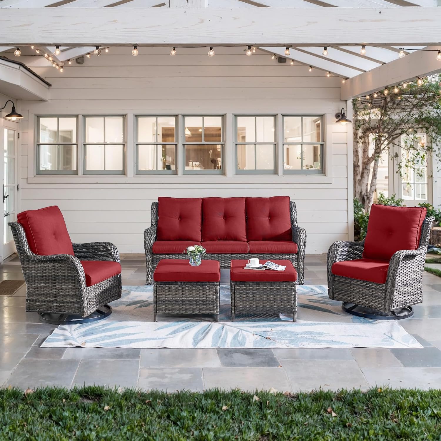 - Patio Furniture Set Introduction: The 5-piece patio furniture set includes 2 swivel glider chairs, 2 ottoman and a sofa, ottoman can not only be used to relax your legs, but also can be used as a small table or small stool. The swivel chairs can hold up to 350 pounds.