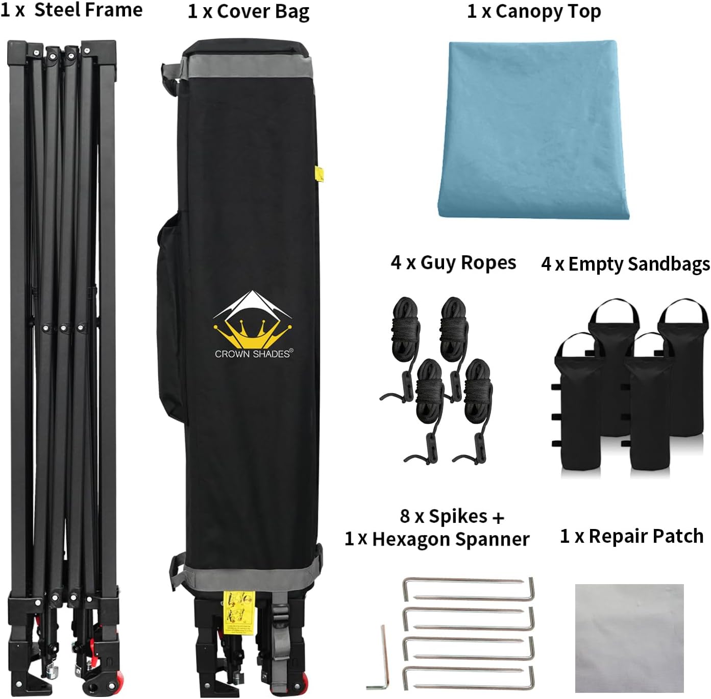 - STO’ N GO SYSTEM - Our lift-free transport system makes it easy to collapse the party tent, cover it with the bag, and roll it away. The 10x10 tents can be stored with the fabric attached, with a specialized pocket for 4 sandbags, 8 stakes, and 4 guy ropes. Integrated wheels in the feet allow easy movement even when the instant shelter tent is set up, by simply lifting the side without wheels. This feature is especially useful for quick setup and takedown at locations like the sports or events.