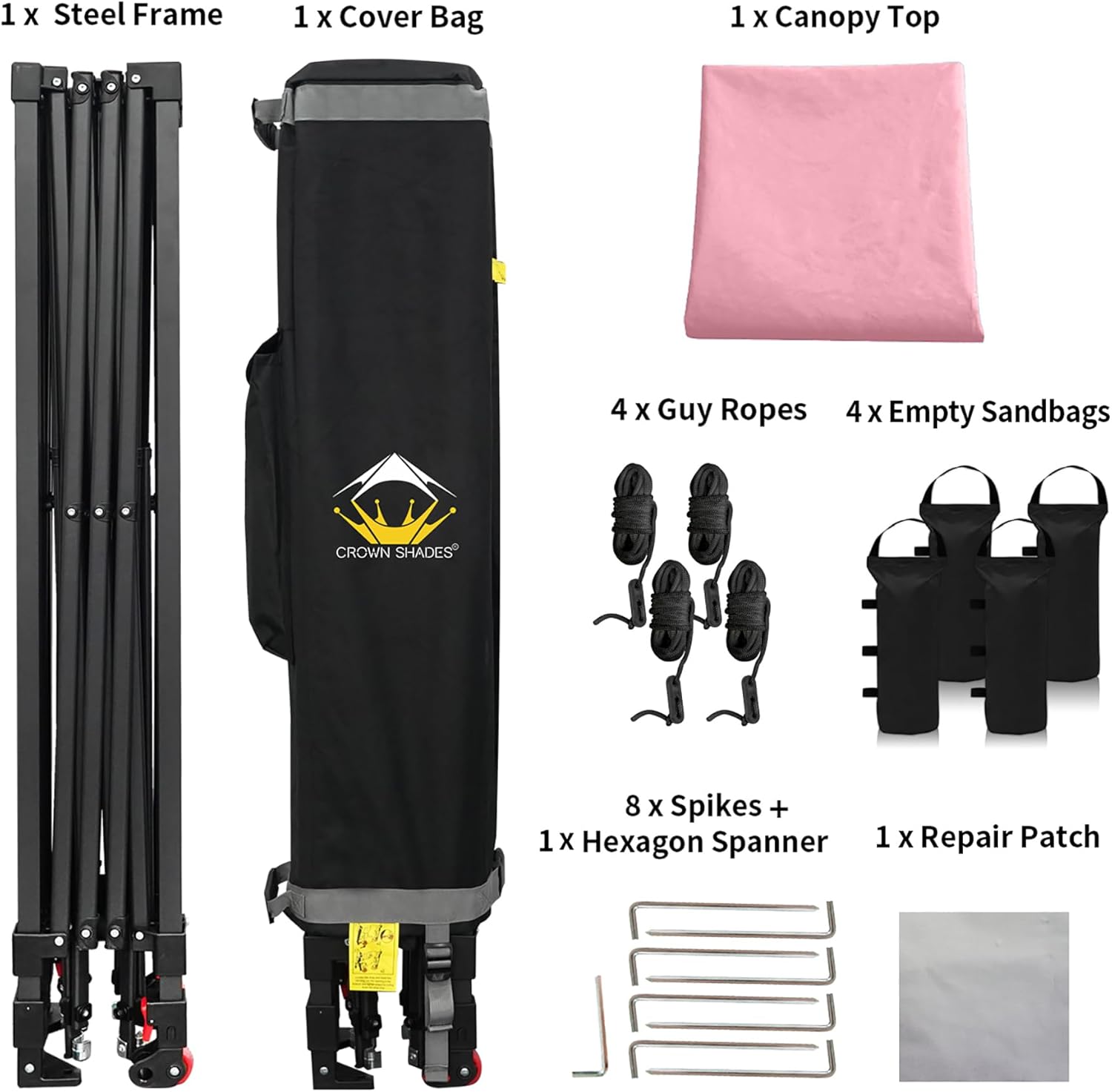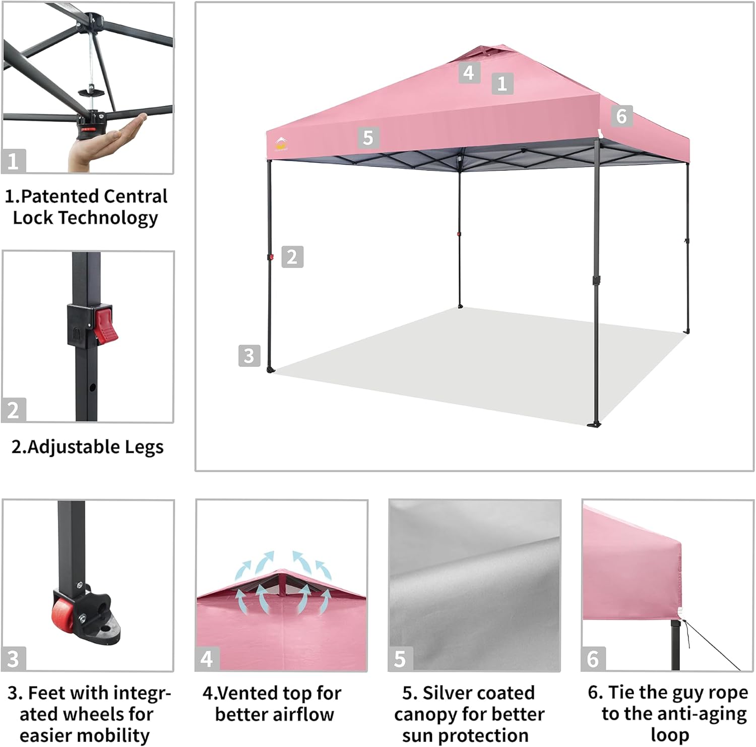 CROWN SHADES 10x10 Pop Up Canopy Tent - Patented Center Lock One Push Instant Outdoor Canopy Beach Tent with STO-N-Go Bag 8 Stakes & 4 Sand Bags,Pink
