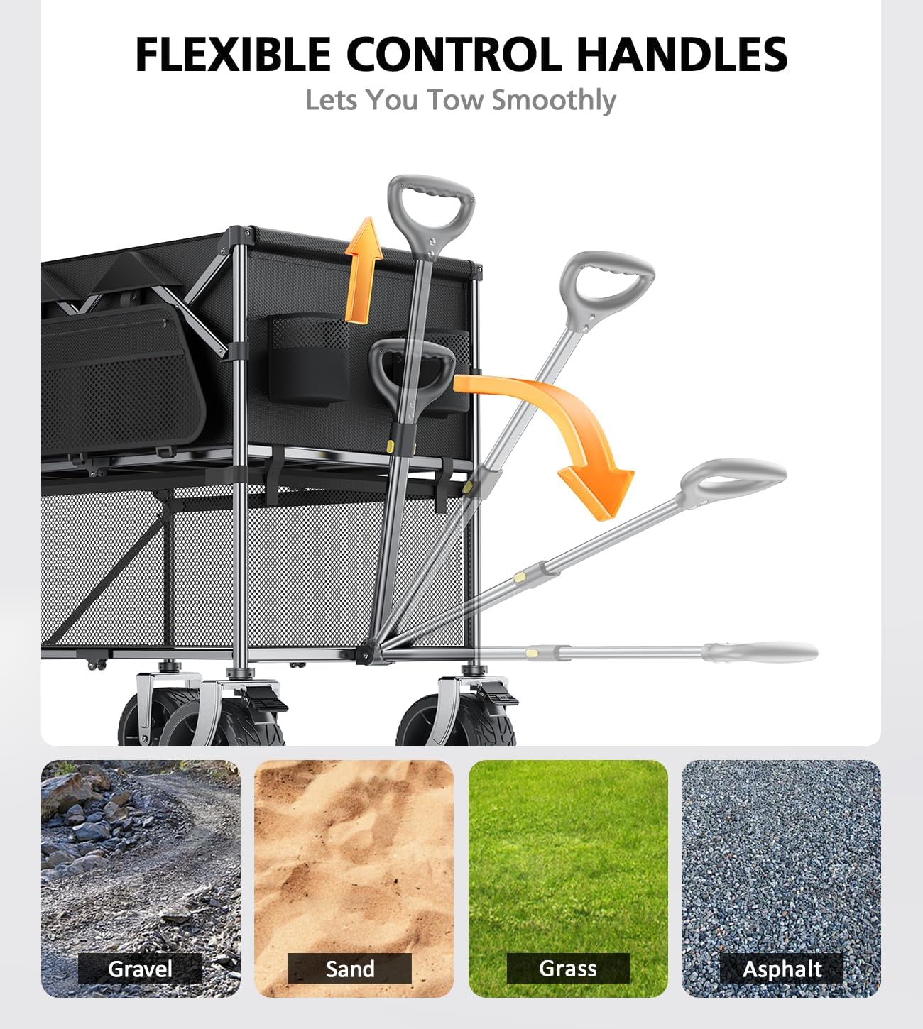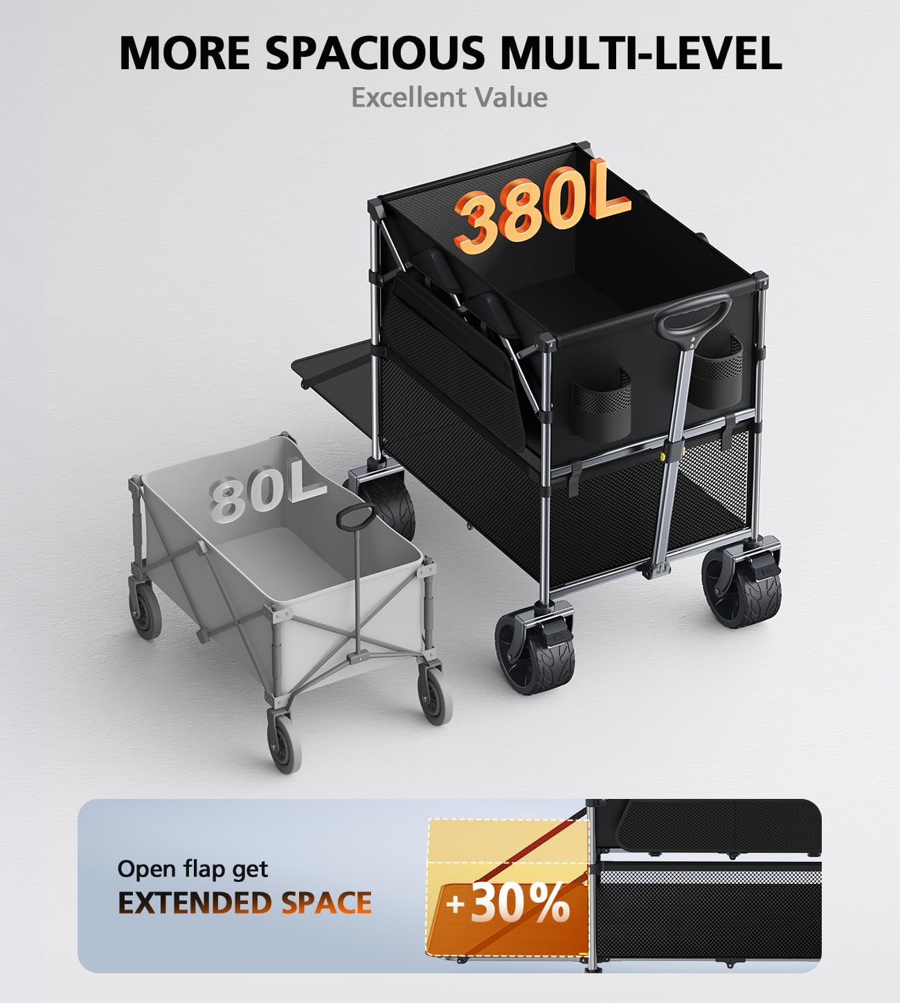 Foldable Wagon Cart,Everyfun 480Lbs Double Decker Wagon,Beach Carts with Big Wheels&Side Pocket&Dustbag,Large Capacity Folding Wagon for Shopping,Garden,Camping,Fish,New Wave Sports Wagon-Black