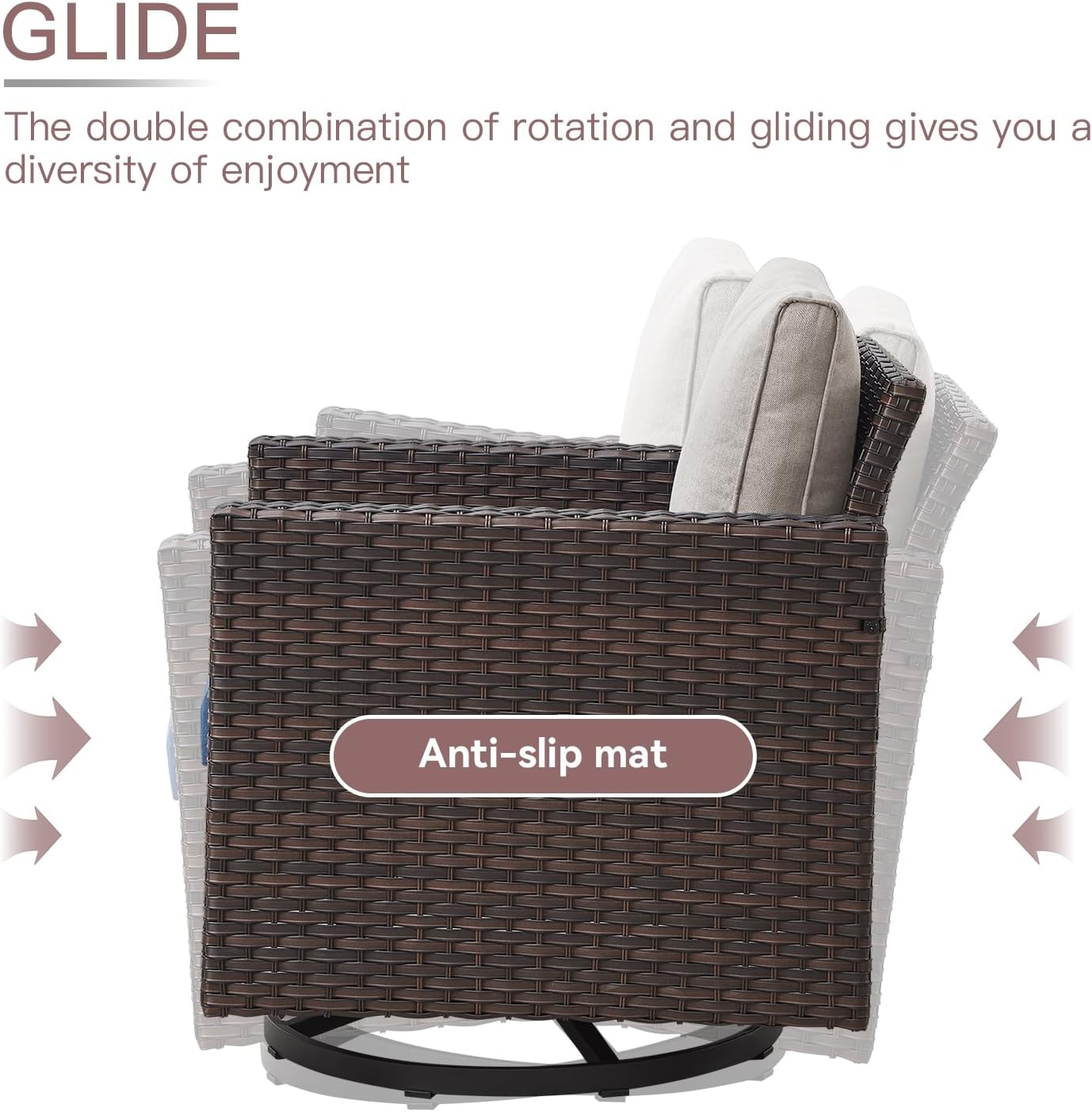 - 360°Swivel Glider Chairs: Design of rotating 360 degree,swinging back and forth,You can easily turn your face away from the sun without moving the entire chair, or swing your seat like a cradle for the ultimate relaxation while listening to music or watching your children play outside.