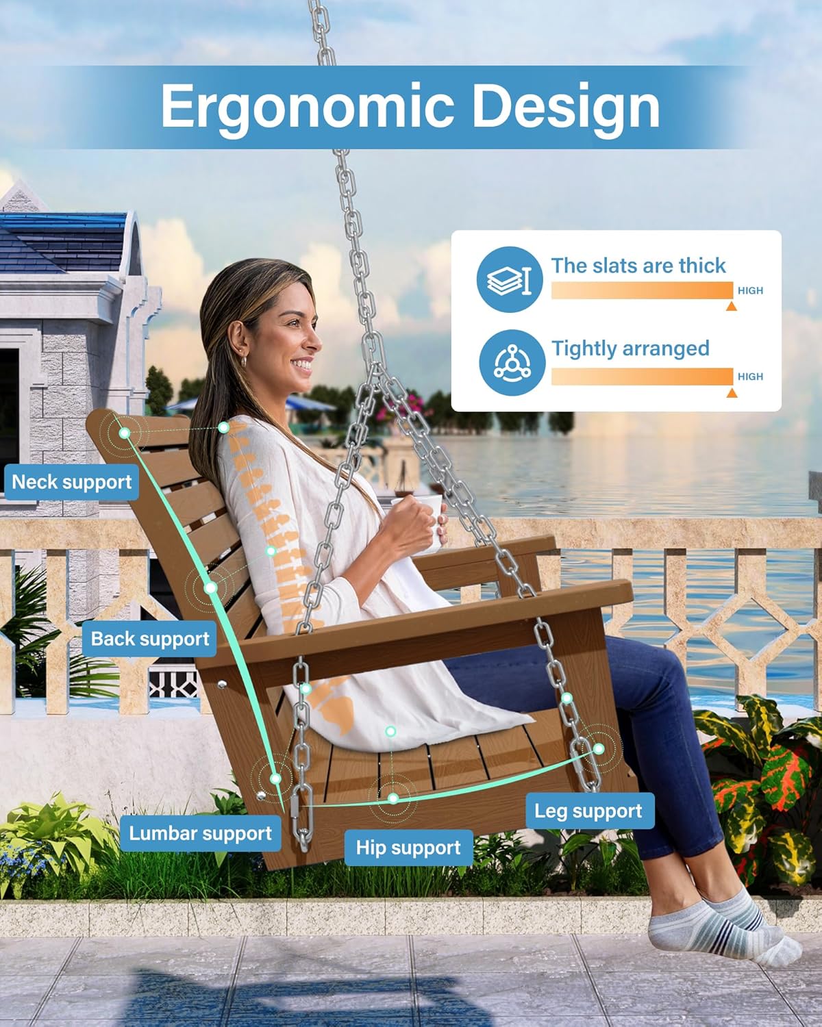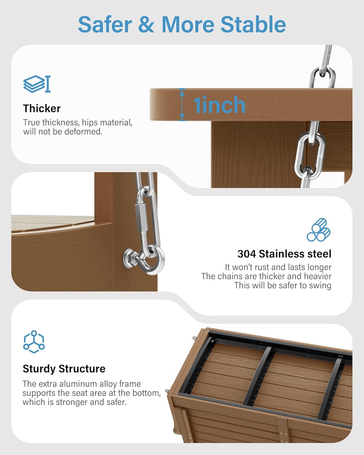 - [Heavy Duty]:The YEFU swing bench has two seats. Seat dimensions: 47.8" W x 18.3" D x 21.78"H. Able to better support your body. Chain length is 89". Suitable for both adults and children. Weight capacity is 800LBS.