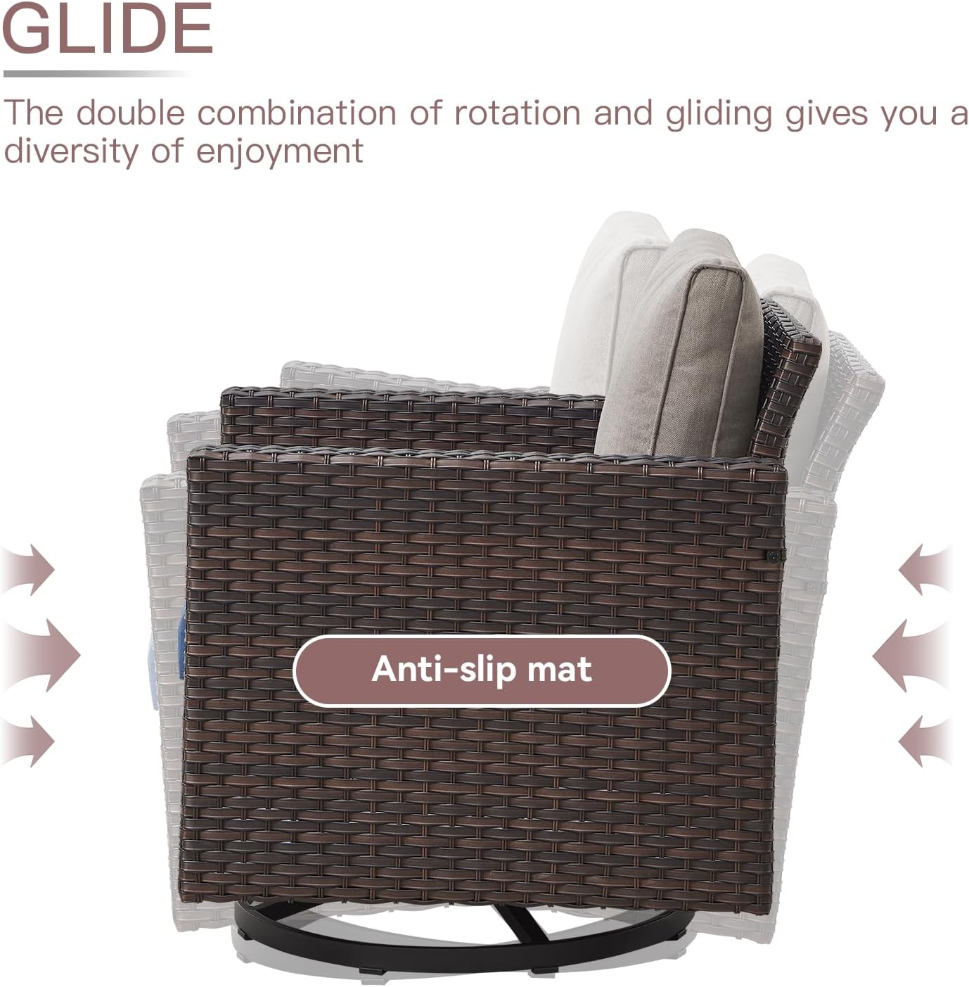 - 360°Swivel Glider Chairs: Design of rotating 360 degree,swinging back and forth,You can easily turn your face away from the sun without moving the entire chair, or swing your seat like a cradle for the ultimate relaxation while listening to music or watching your children play outside.
