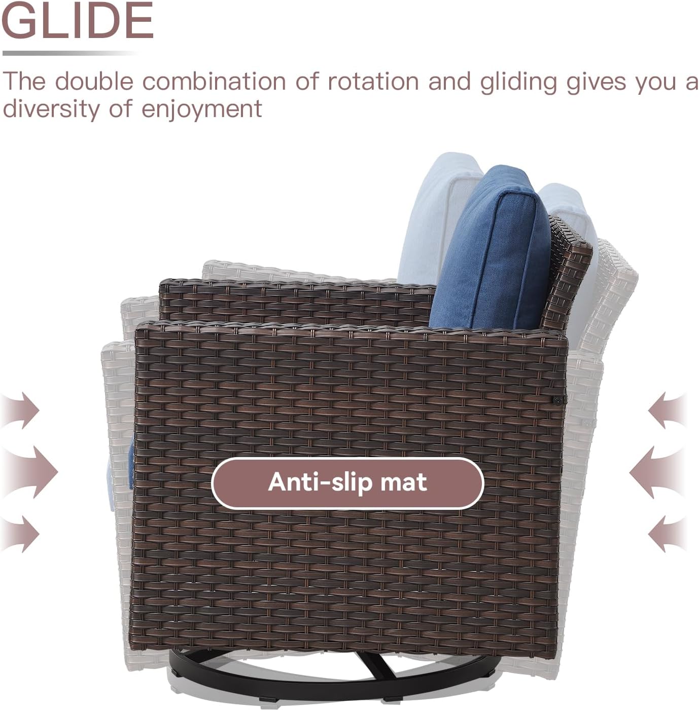 - 360°Swivel Glider Chairs: Design of rotating 360 degree,swinging back and forth,You can easily turn your face away from the sun without moving the entire chair, or swing your seat like a cradle for the ultimate relaxation while listening to music or watching your children play outside.