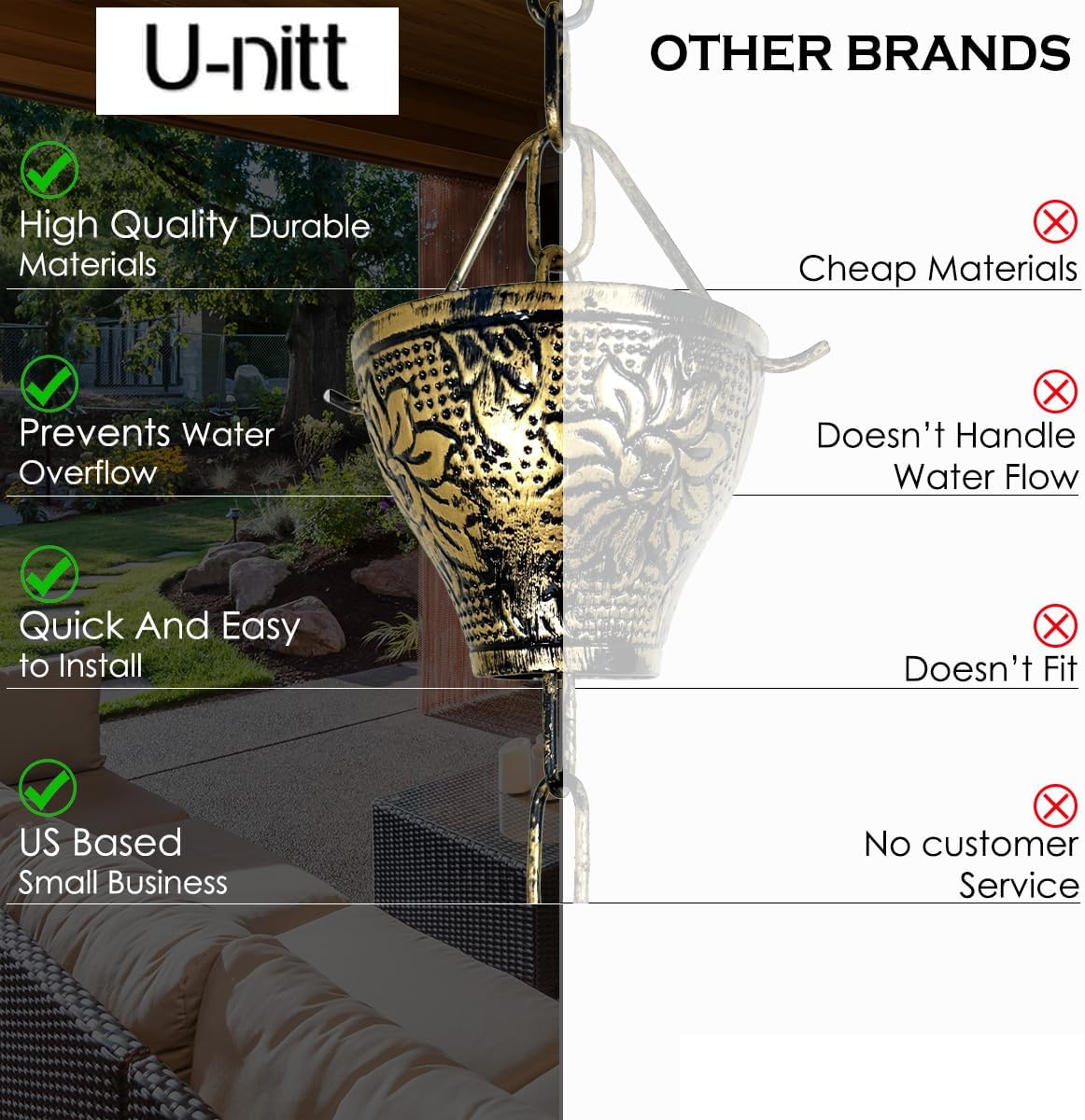 - SUPERIOR CRAFTSMANSHIP - is evident in every detail of this expertly designed U-nitt rain chain. Meticulously crafted from premium, heavy-duty materials, it offers both durability and elegance. Each link or cup is precision-shaped to ensure smooth water flow, effectively guiding rainwater from your gutter in a graceful cascade. Rust-resistant and built to last, this rain chain blends functionality with artistry, adding a refined touch to your home’s exterior while enhancing rainwater management.