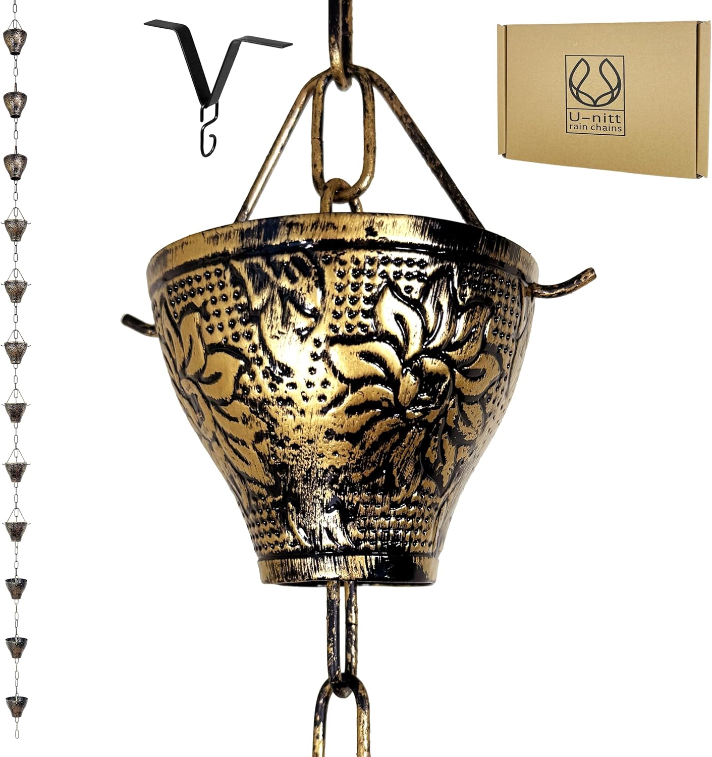 - SHOP WITH CONFIDENCE - U-nitt premium rain water chain for gutter downspout is designed for durability and efficiency. Made with high-quality materials, it ensures long-lasting performance in all weather conditions. Each receptacle cup features a drainage to prevent overflow, while the cascading rain catcher chain collects rainwater efficiently. This complete rain chain kit, including a 8.5 ft chain, a gutter adapter clip and an an S hook. PLEASE NOTE THAT THE BOWL IN THE PHOTOS IS NOT INCLUDED.